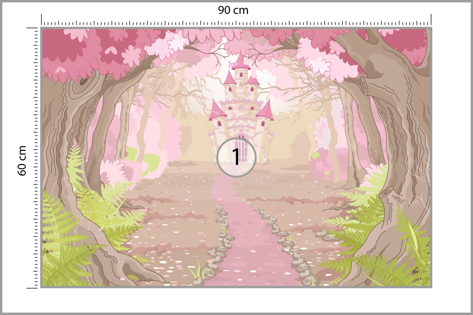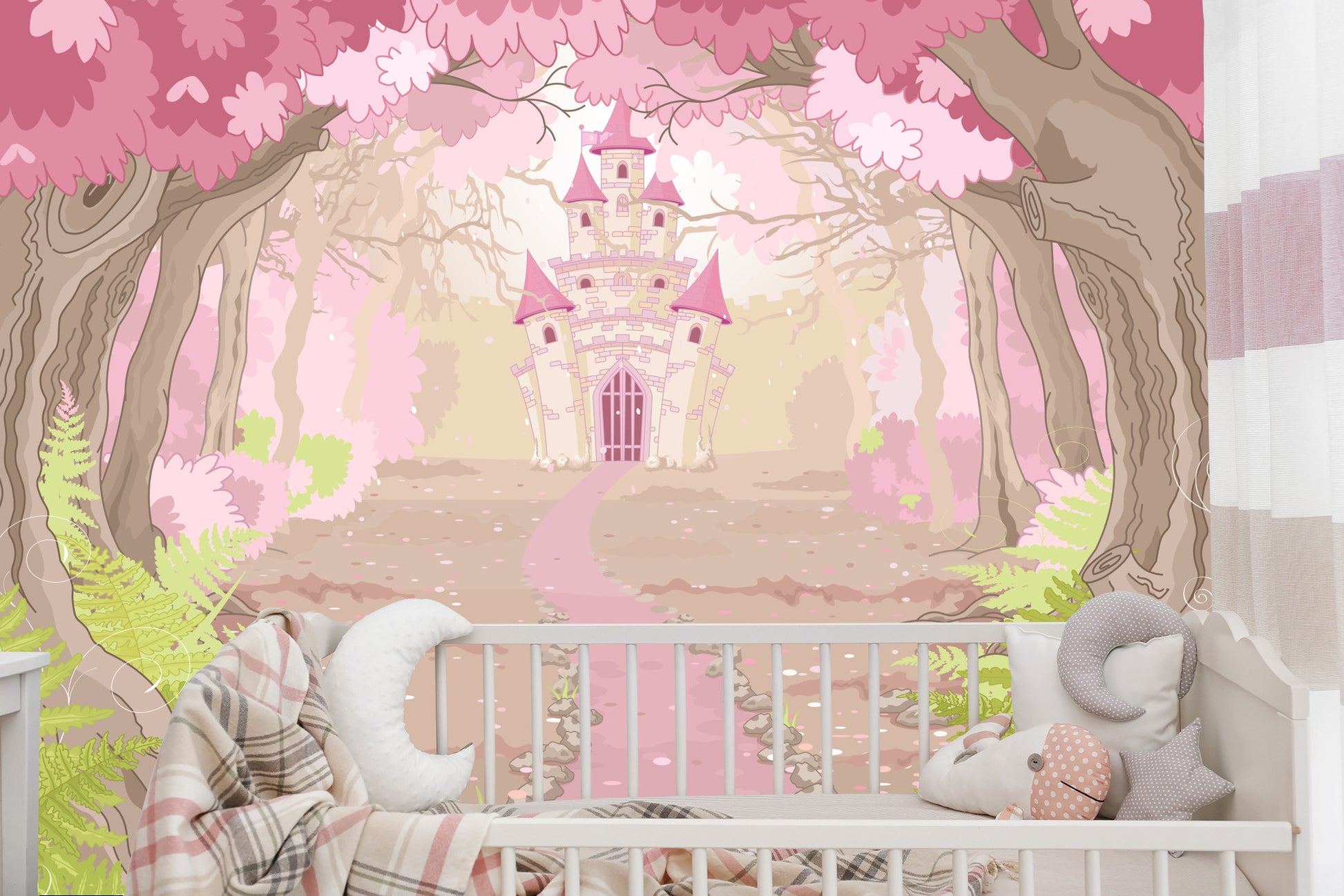 Verwandle dein Mädchenzimmer in eine märchenhafte Prinzessinnen-Welt mit der Fototapete Schloss im rosafarbenen Wald – eine zauberhafte Wandgestaltung, die kleine Prinzessinnen begeistert. Die Tapete wird mit Kleber geliefert. Hole dir jetzt die magische Atmosphäre eines Märchenschlosses in deine Räume.