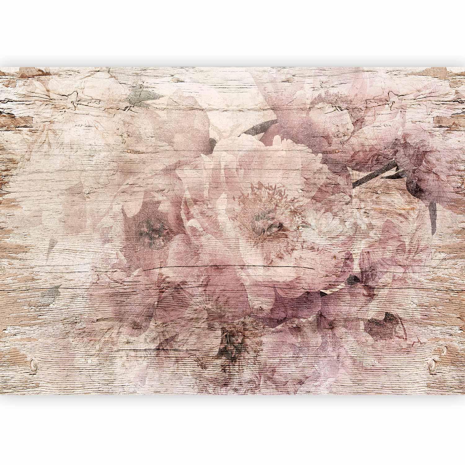 Diese Fototapete mit Blumen und Holzoptik bringt gemütliche Eleganz und natürlichen Charme in dein Zuhause – perfekt für alle, die Landhaus-Stil und romantische Blumenmotive lieben.