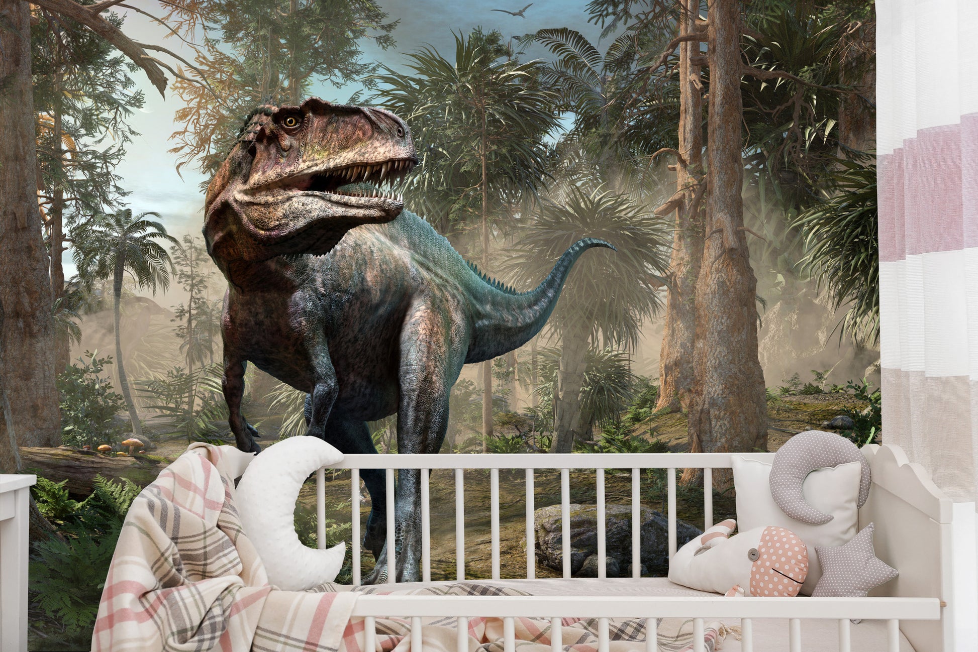 Verwandle das Kinderzimmer in eine spannende Urzeit-Landschaft mit dieser faszinierenden Fototapete. Realistische Dinosaurier zwischen üppigen Palmen erwecken die prähistorische Welt zum Leben und begeistern kleine Dino-Fans. Perfekt für abenteuerlustige Kinder und Jurassic-Liebhaber.