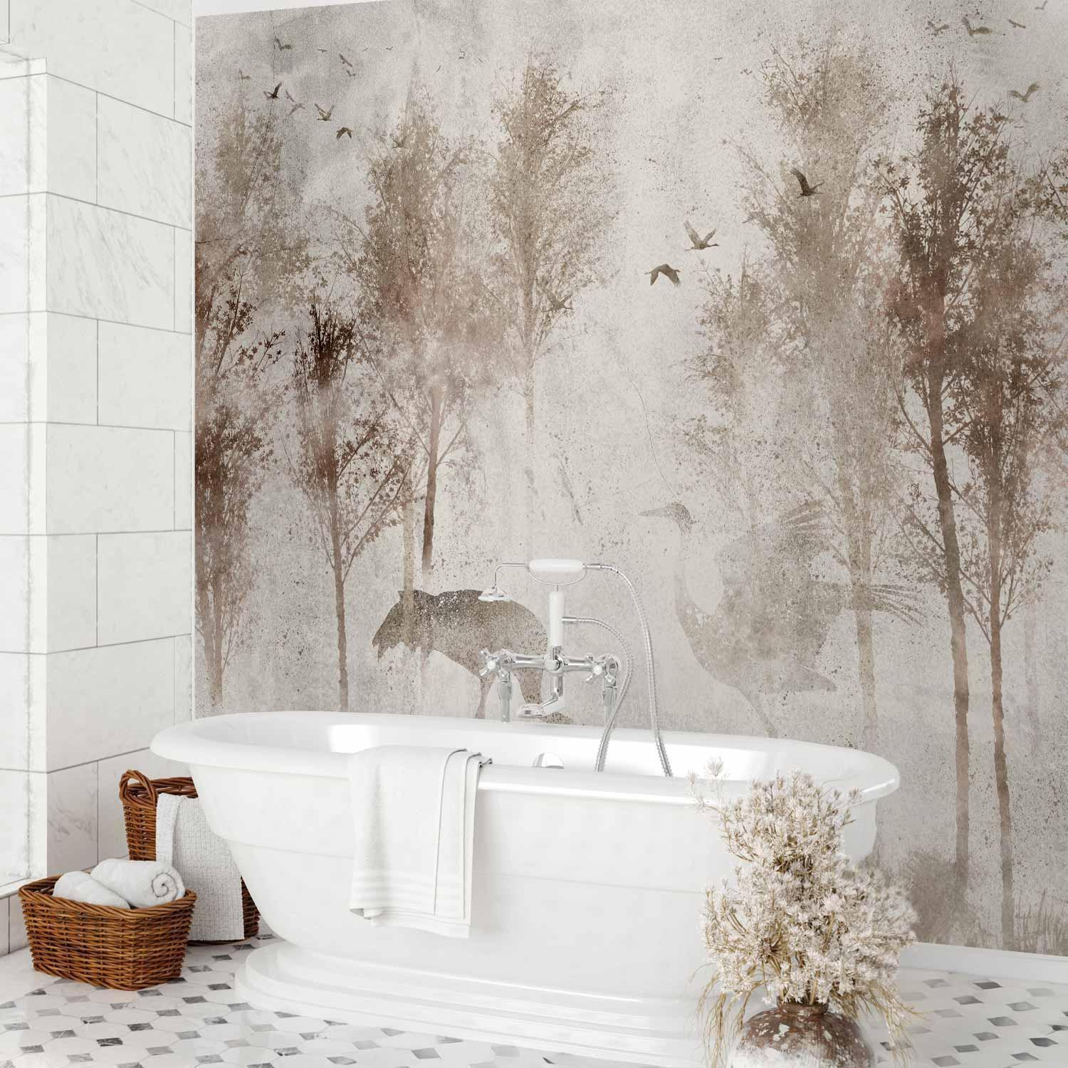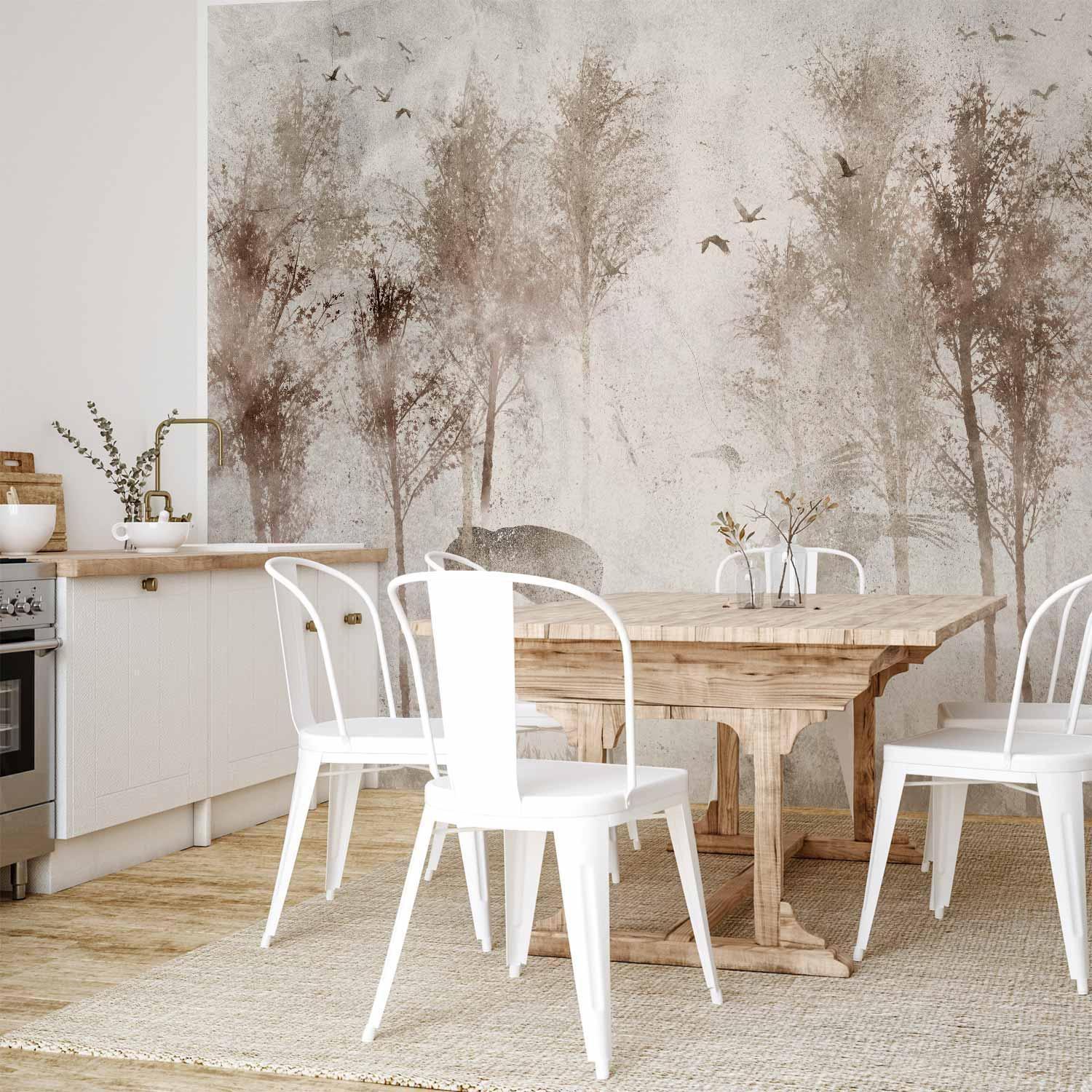 Fototapeten sind in den letzten Jahren eine häufige Wahl für Wanddekoration geworden. Sie sind eine großartige Wanddeko, die sich für verschiedene Räume eignet. Fototapeten sind eine hervorragende Alternative für das Wohnzimmer, für das Schlafzimmer und auch für das Kinderzimmer. Diese einzigartigen Dekorationen passen in praktisch jeden Raum. Wenn Sie sich immer noch fragen, ob dies die richtige Wahl ist, sind Sie hier genau richtig. Fototapete "Fototapete - Among the trees - landscape in grey tones in fog in a clearing with birds" wird Ihr Interieur völlig verändern. Hier finden Sie, was Sie brauchen.