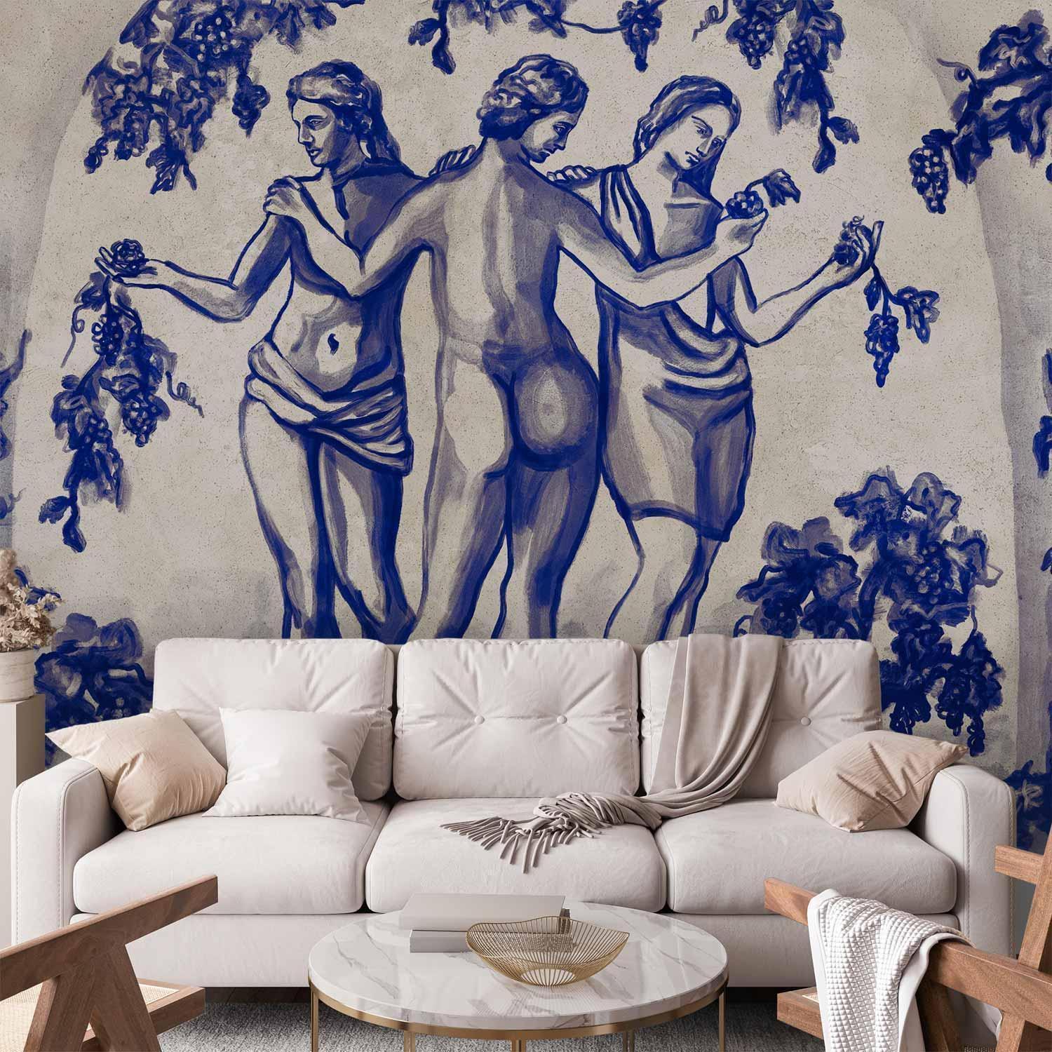 Fototapeten sind in den letzten Jahren eine häufige Wahl für Wanddekoration geworden. Sie sind eine großartige Wanddeko, die sich für verschiedene Räume eignet. Fototapeten sind eine hervorragende Alternative für das Wohnzimmer, für das Schlafzimmer und auch für das Kinderzimmer. Diese einzigartigen Dekorationen passen in praktisch jeden Raum. Wenn Sie sich immer noch fragen, ob dies die richtige Wahl ist, sind Sie hier genau richtig. Fototapete "Fototapete - Ancient vineyard - three women in a portal painted with blue ink" wird Ihr Interieur völlig verändern. Hier finden Sie, was Sie brauchen.