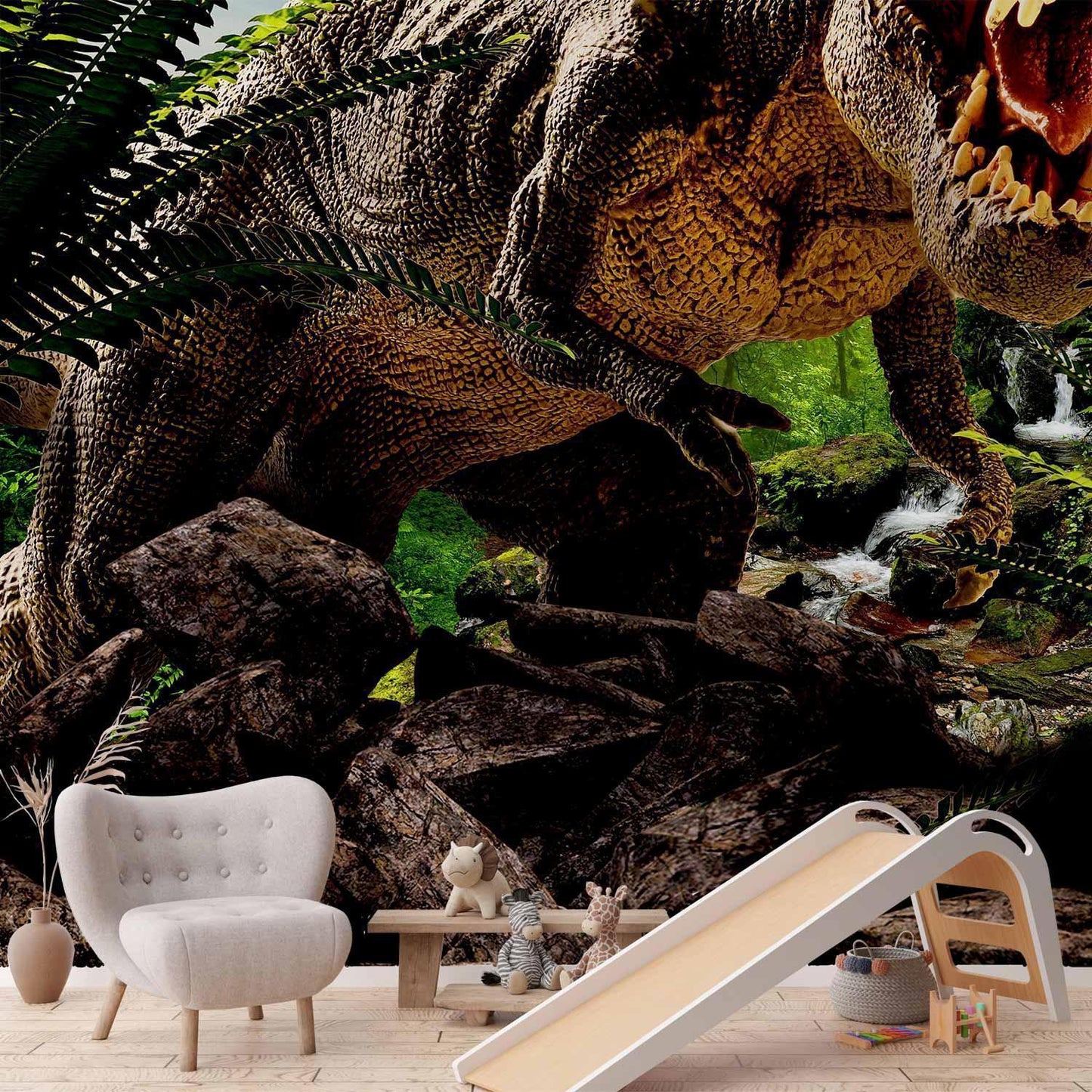 Dank ihres spannenden und lehrreichen Designs passt die Wandtapete Wütender Tyrannosaurus perfekt in verschiedene Kinderzimmer. Ideal als beeindruckende Akzentwand im Jungenzimmer, zur Schaffung einer abenteuerlichen Atmosphäre im Spielzimmer oder als inspirierender Hintergrund im Lernbereich. Sie harmoniert hervorragend mit Möbeln in natürlichen Holztönen, Grün-, Braun- und Erdtönen. Besonders schön wirkt sie mit natürlichen Materialien wie Holz, robusten Textilien und Dinosaurier-Accessoires sowie mit Büchern über Urzeit und Natur.