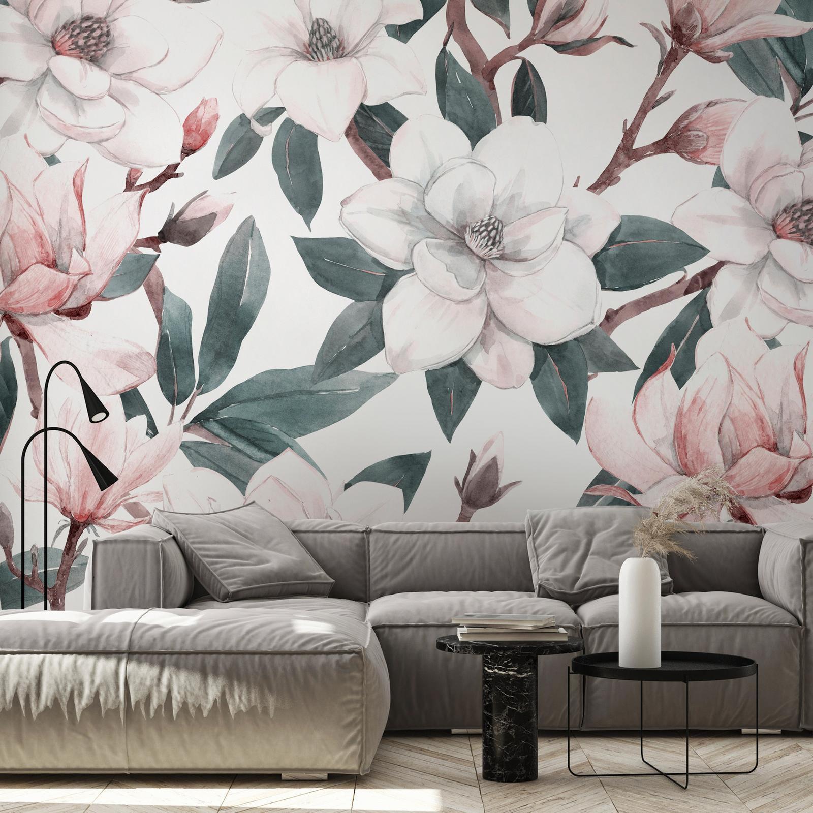 Bringen Sie natürliche Schönheit und Leichtigkeit in Ihr Zuhause mit der Fototapete Aquarell Magnolien – Zweite Variante.