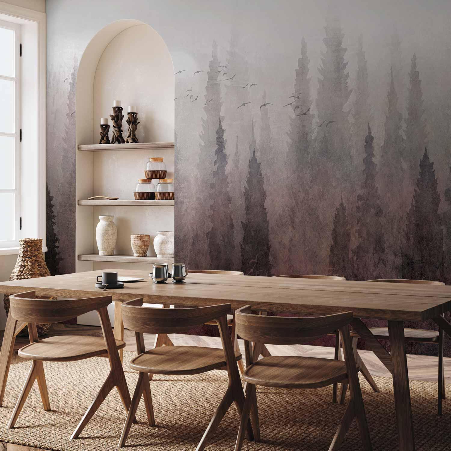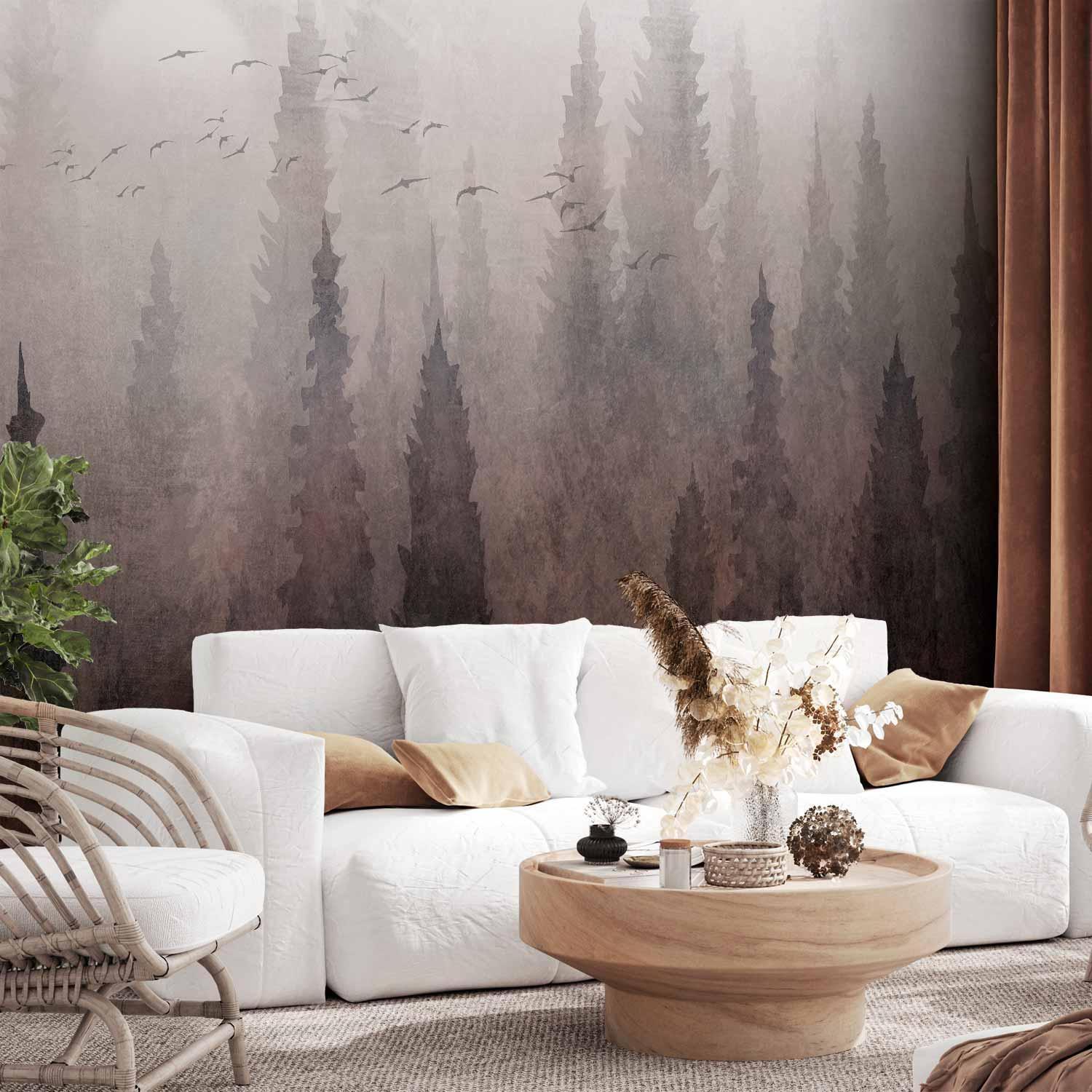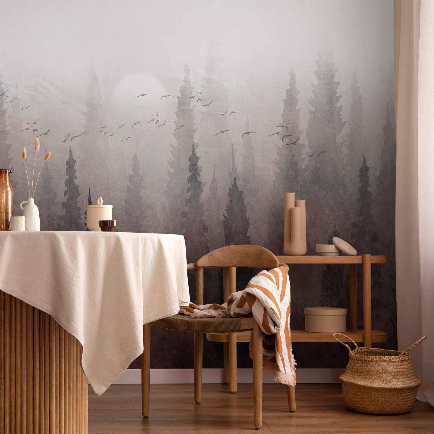 Fototapeten sind in den letzten Jahren eine häufige Wahl für Wanddekoration geworden. Sie sind eine großartige Wanddeko, die sich für verschiedene Räume eignet. Fototapeten sind eine hervorragende Alternative für das Wohnzimmer, für das Schlafzimmer und auch für das Kinderzimmer. Diese einzigartigen Dekorationen passen in praktisch jeden Raum. Wenn Sie sich immer noch fragen, ob dies die richtige Wahl ist, sind Sie hier genau richtig. Fototapete "Fototapete - Bird's flight over treetops - landscape of a dark forest in fog" wird Ihr Interieur völlig verändern. Hier finden Sie, was Sie brauchen.