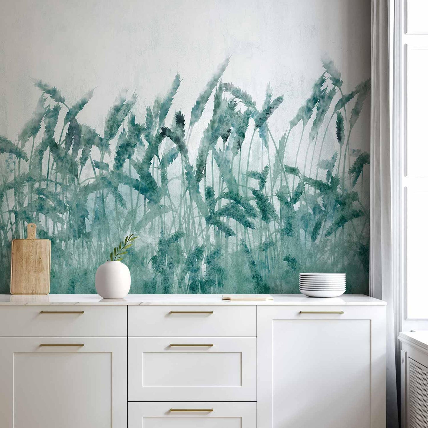 Fototapete – Blaue Weizenhalme: Sanfte Natur in moderner Interpretation