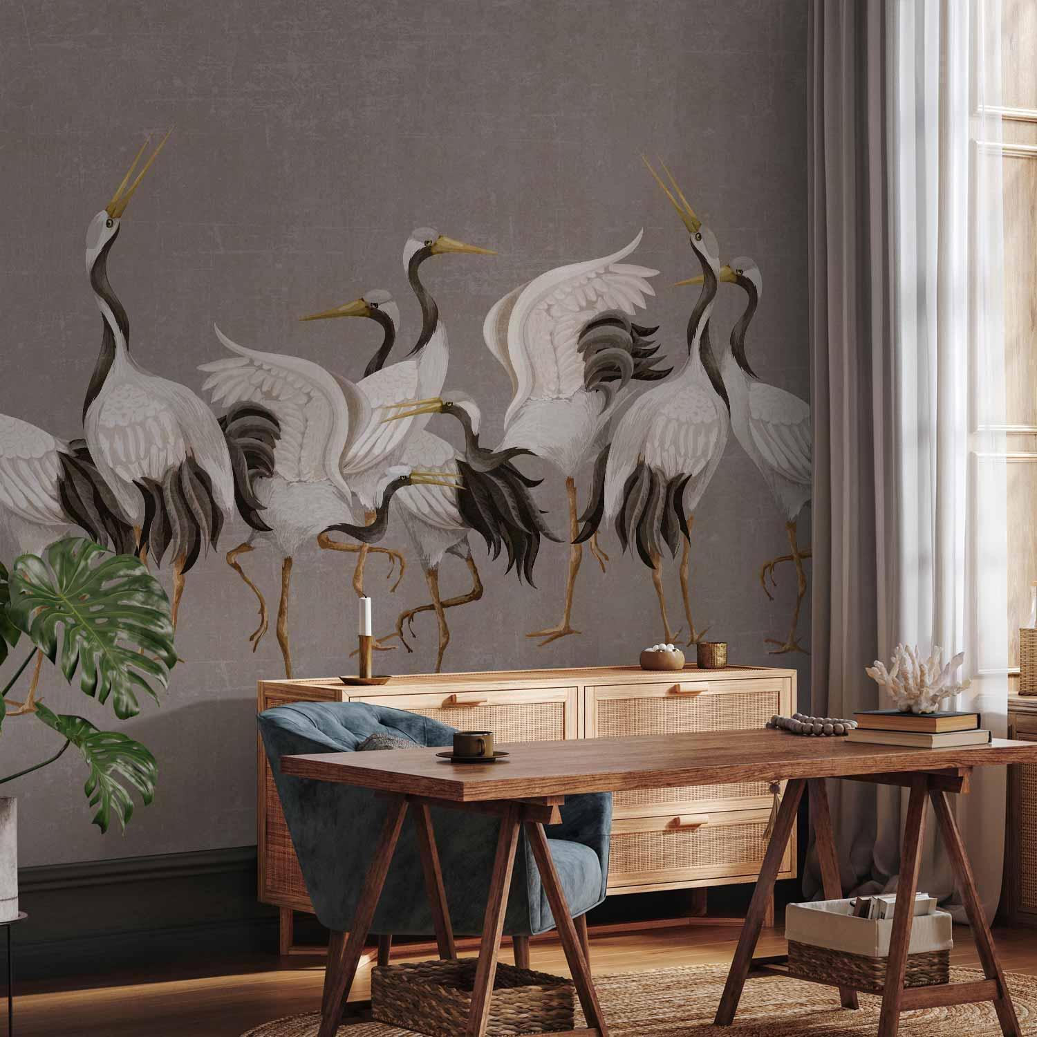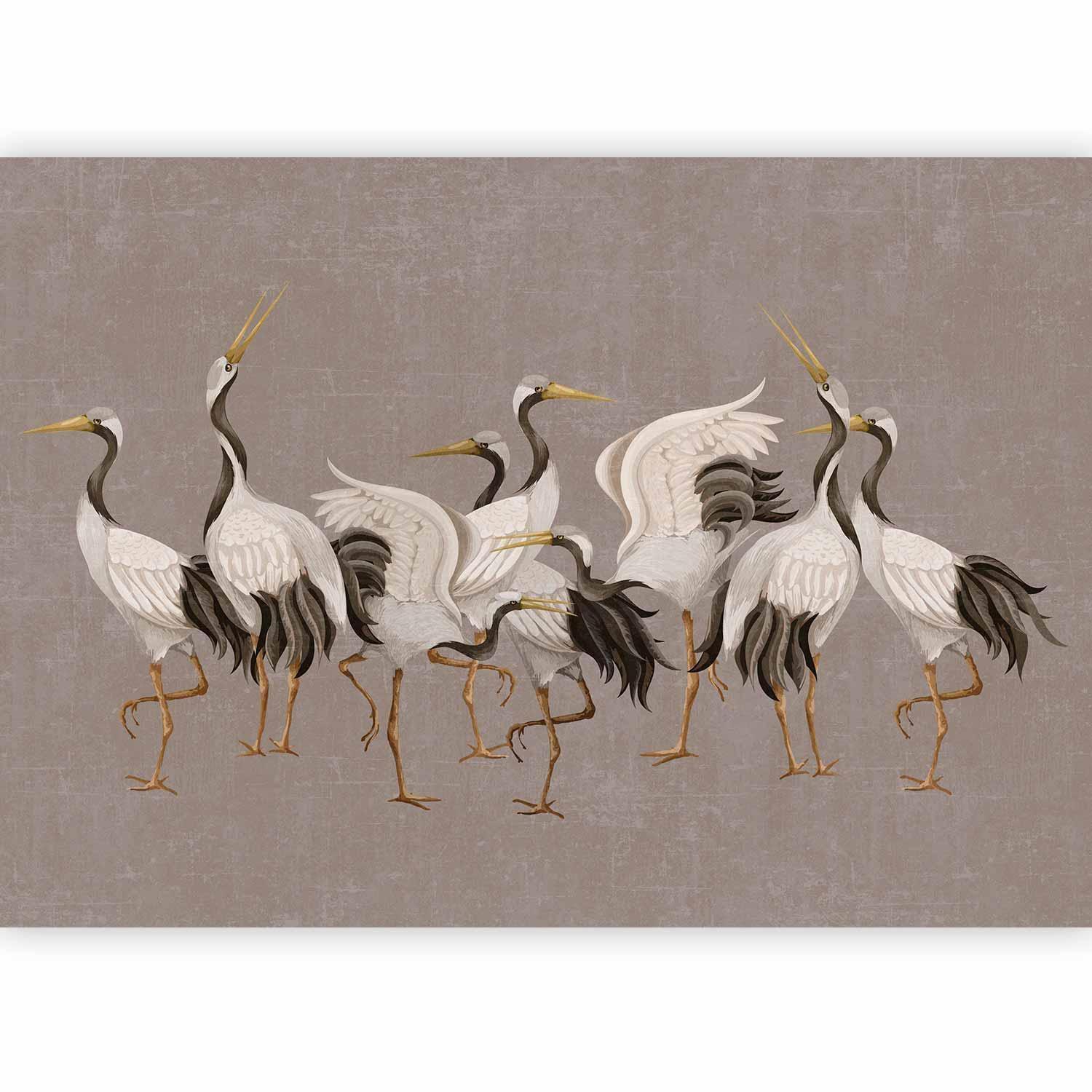 Fototapete - Crane dance – bright silhouettes of birds against a warm grey background with texture