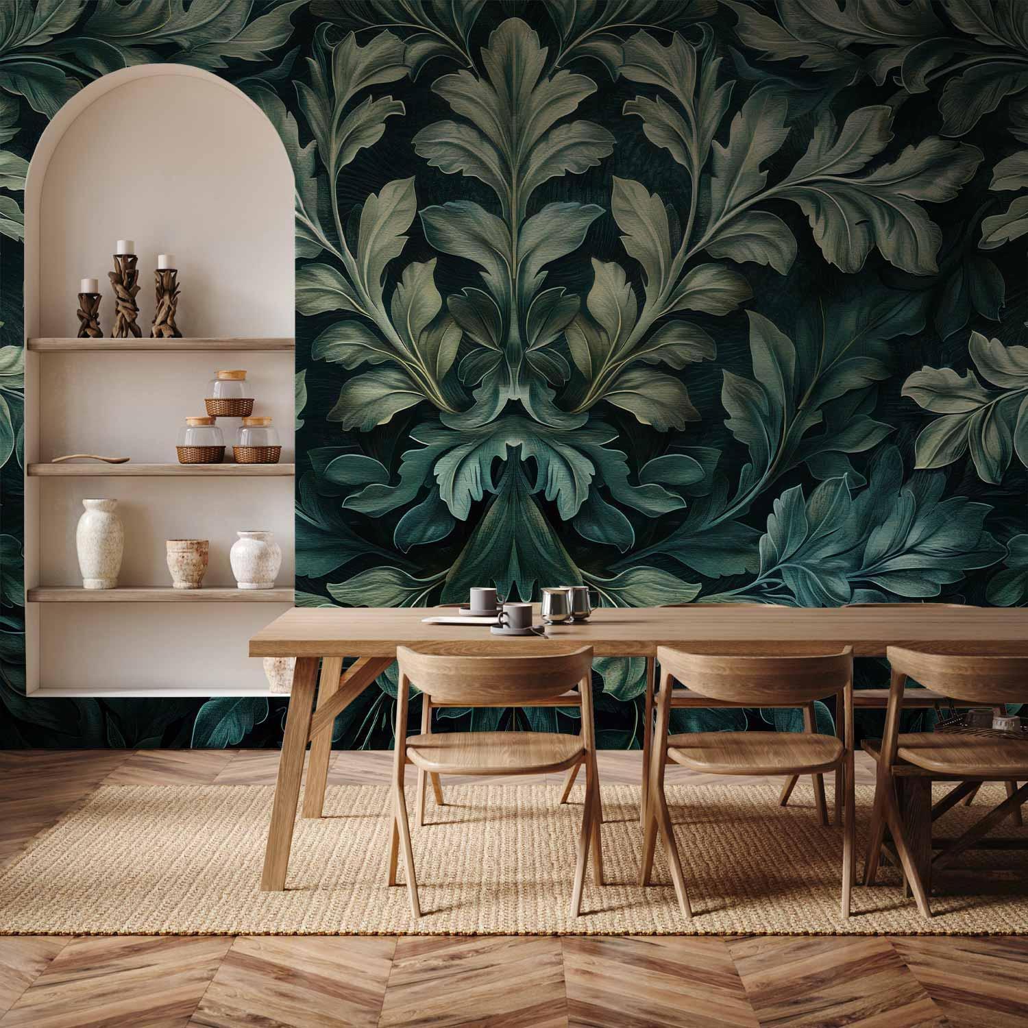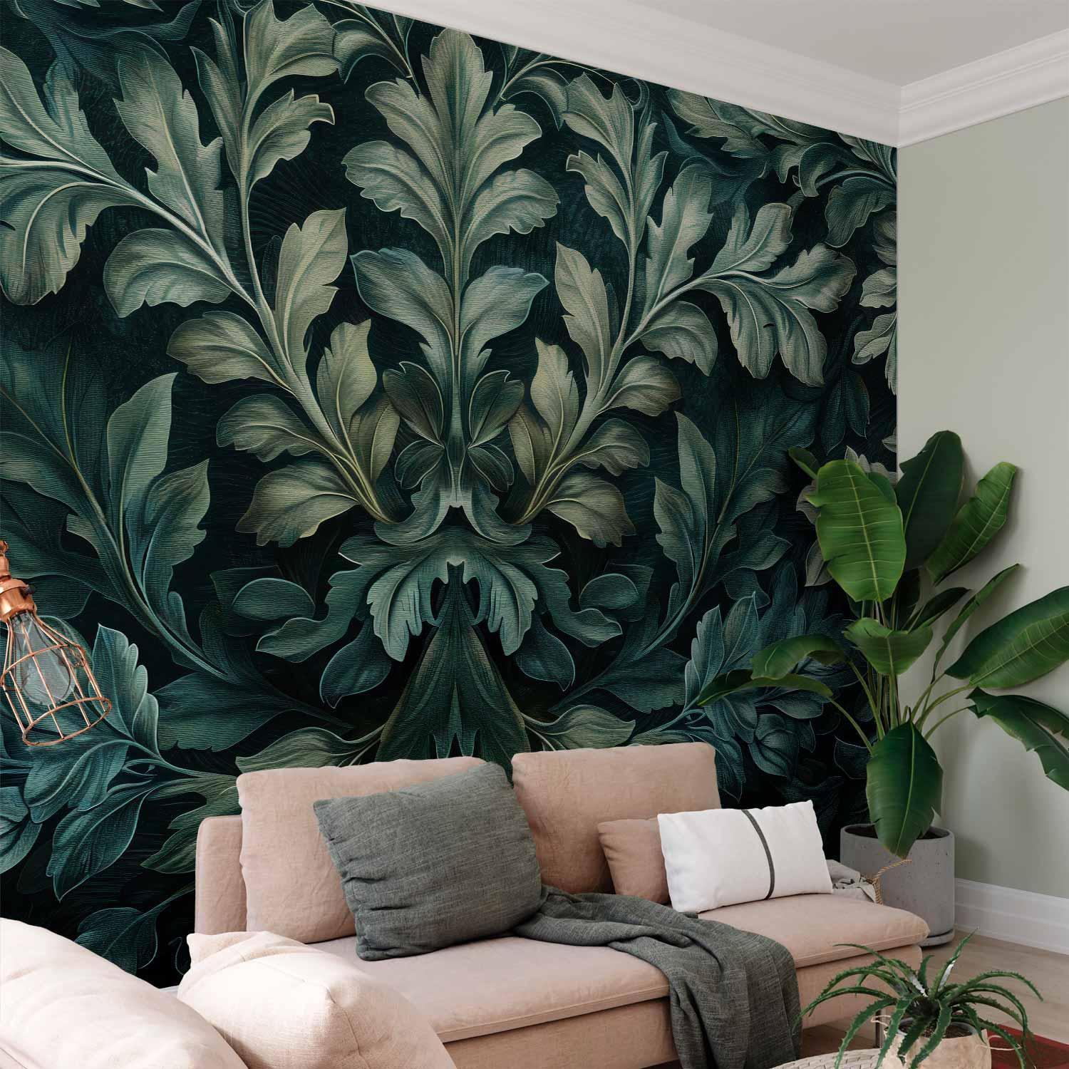 Fototapete "Fototapete - Dark Green Victorian Leaves: Botanical Carved Composition" ist ein hochwertiger Digitaldruck, der ein qualitativ hochwertiges Produkt und eine einfache Montage garantiert. Fototapete Schlafzimmer ist eine Revolution in der Wandgestaltung. Wählen Sie das passende Universalmotiv für Ihr Schlafzimmer und genießen Sie jede Nacht einen einzigartigen Ausblick. Sie können die Größe der Dekoration an Ihre räumlichen Gegebenheiten anpassen. Außerdem können Sie das Material und die zusätzlichen Effekte wählen, die auf der Fototapete Schlafzimmer zu sehen sind. Ähnliche Motive, die Sie im Schlafzimmer verwenden, können auch in der Küche eingesetzt werden. Die Fototapete Küche eignet sich auch gut für das Schlafzimmer und das Wohnzimmer. Sie können Ihre Wanddekoration nach Belieben konfigurieren und sie so anpassen, dass sie perfekt in jeden Raum passt.