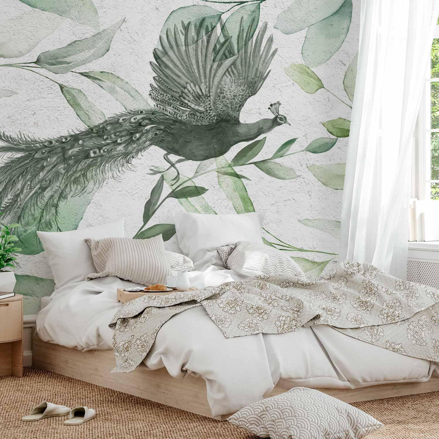 Fototapete "Fototapete - Flight of a Peacock - Third Variant" ist ein hochwertiger Digitaldruck, der ein qualitativ hochwertiges Produkt und eine einfache Montage garantiert. Fototapete Schlafzimmer ist eine Revolution in der Wandgestaltung. Wählen Sie das passende Universalmotiv für Ihr Schlafzimmer und genießen Sie jede Nacht einen einzigartigen Ausblick. Sie können die Größe der Dekoration an Ihre räumlichen Gegebenheiten anpassen. Außerdem können Sie das Material und die zusätzlichen Effekte wählen, die auf der Fototapete Schlafzimmer zu sehen sind. Ähnliche Motive, die Sie im Schlafzimmer verwenden, können auch in der Küche eingesetzt werden. Die Fototapete Küche eignet sich auch gut für das Schlafzimmer und das Wohnzimmer. Sie können Ihre Wanddekoration nach Belieben konfigurieren und sie so anpassen, dass sie perfekt in jeden Raum passt.