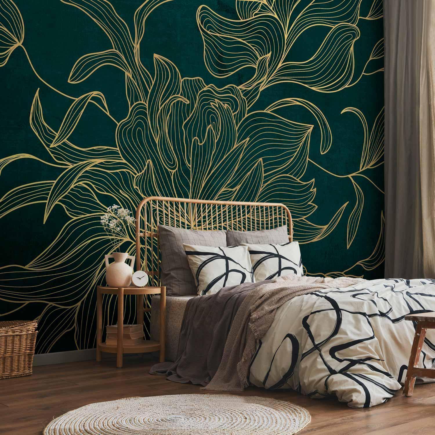 Fototapeten sind in den letzten Jahren eine häufige Wahl für Wanddekoration geworden. Sie sind eine großartige Wanddeko, die sich für verschiedene Räume eignet. Fototapeten sind eine hervorragende Alternative für das Wohnzimmer, für das Schlafzimmer und auch für das Kinderzimmer. Diese einzigartigen Dekorationen passen in praktisch jeden Raum. Wenn Sie sich immer noch fragen, ob dies die richtige Wahl ist, sind Sie hier genau richtig. Fototapete "Fototapete - Green boudoir - linear drawing of a flower in golden colours on a dark background" wird Ihr Interieur völlig verändern. Hier finden Sie, was Sie brauchen.