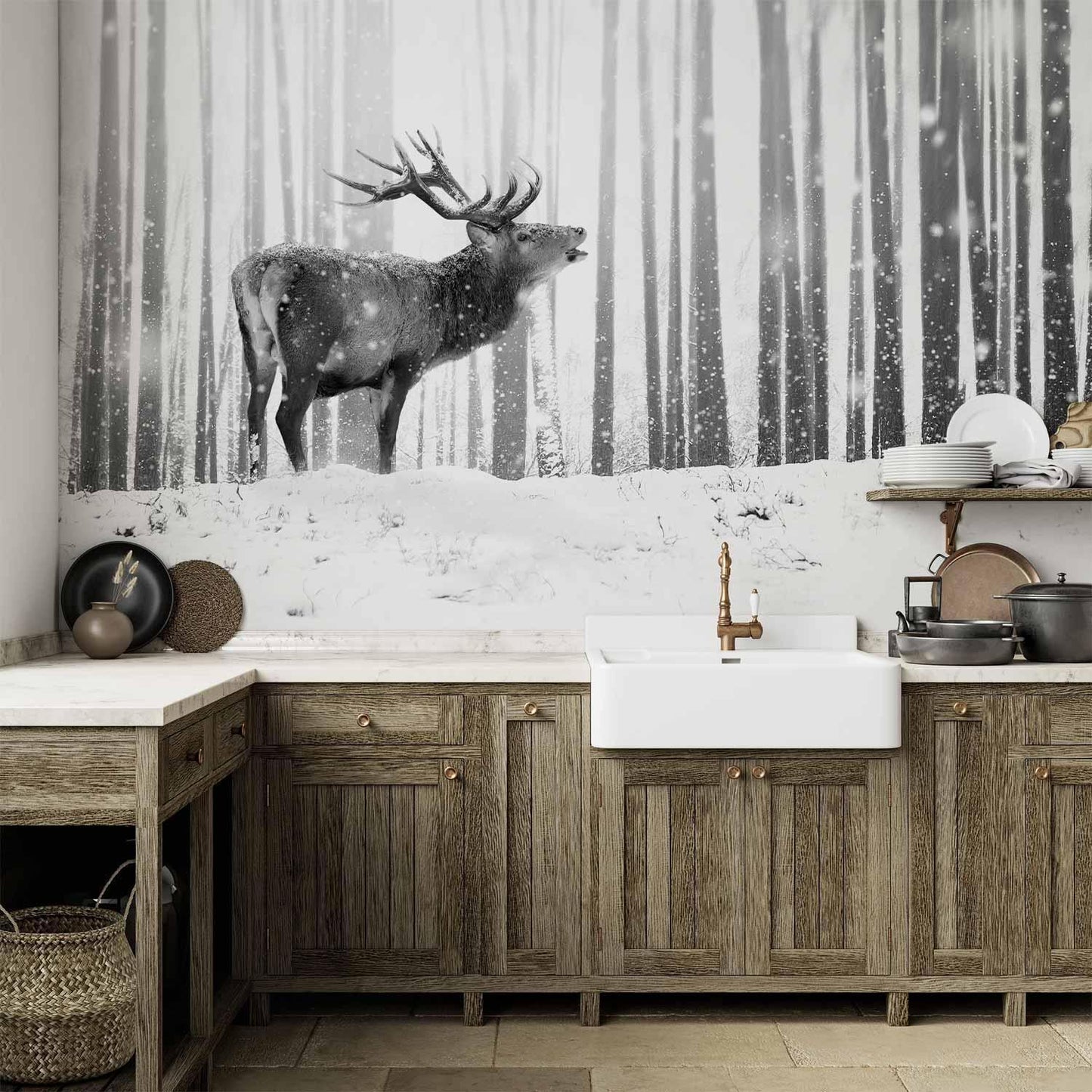 Die Fototapete „Hirsch im Schnee“ zeigt einen majestätischen Hirsch, der inmitten einer verschneiten Winterlandschaft steht. Das Schwarz-Weiß-Design verleiht dem Motiv eine zeitlose Eleganz und bringt eine ruhige, natürliche Atmosphäre in jeden Raum.