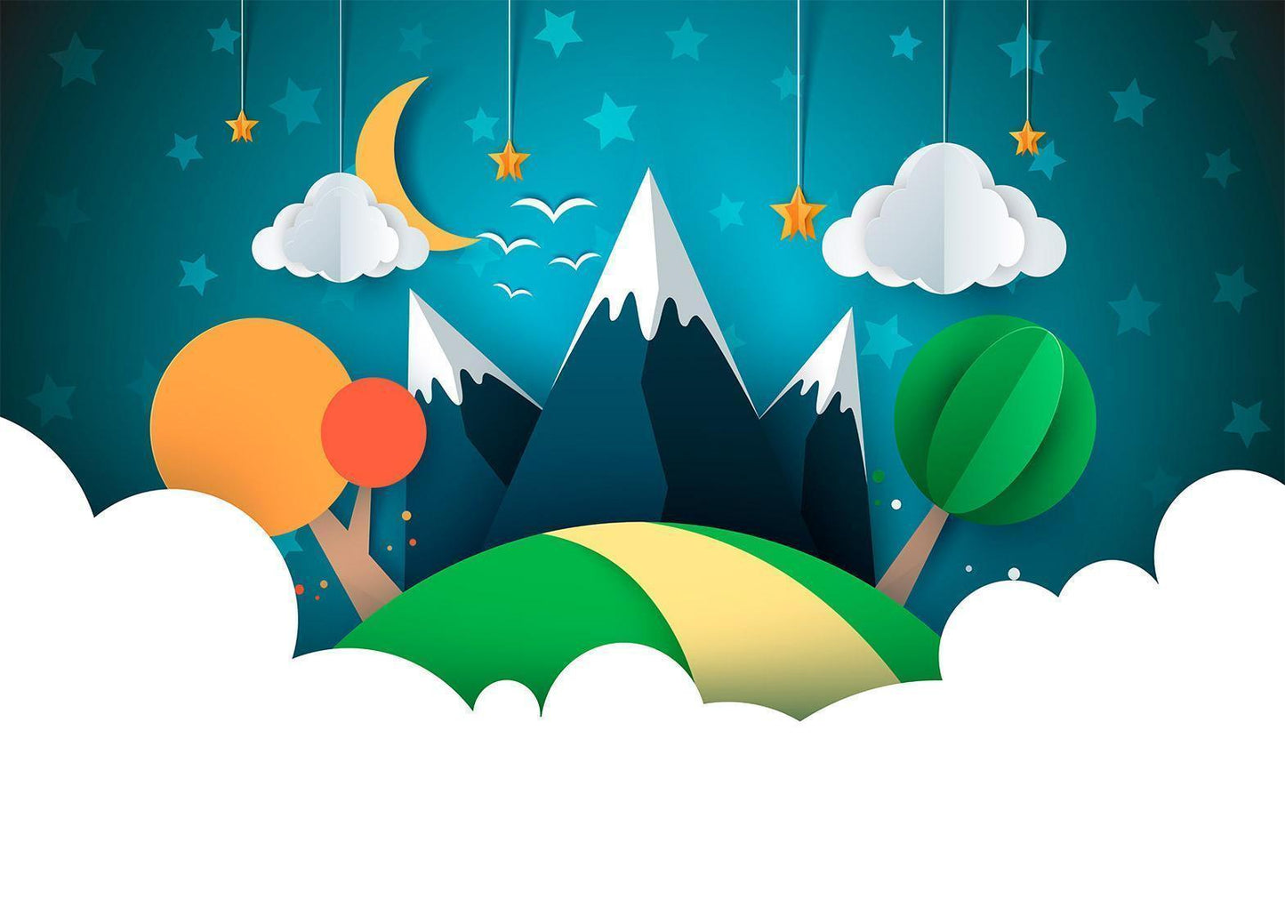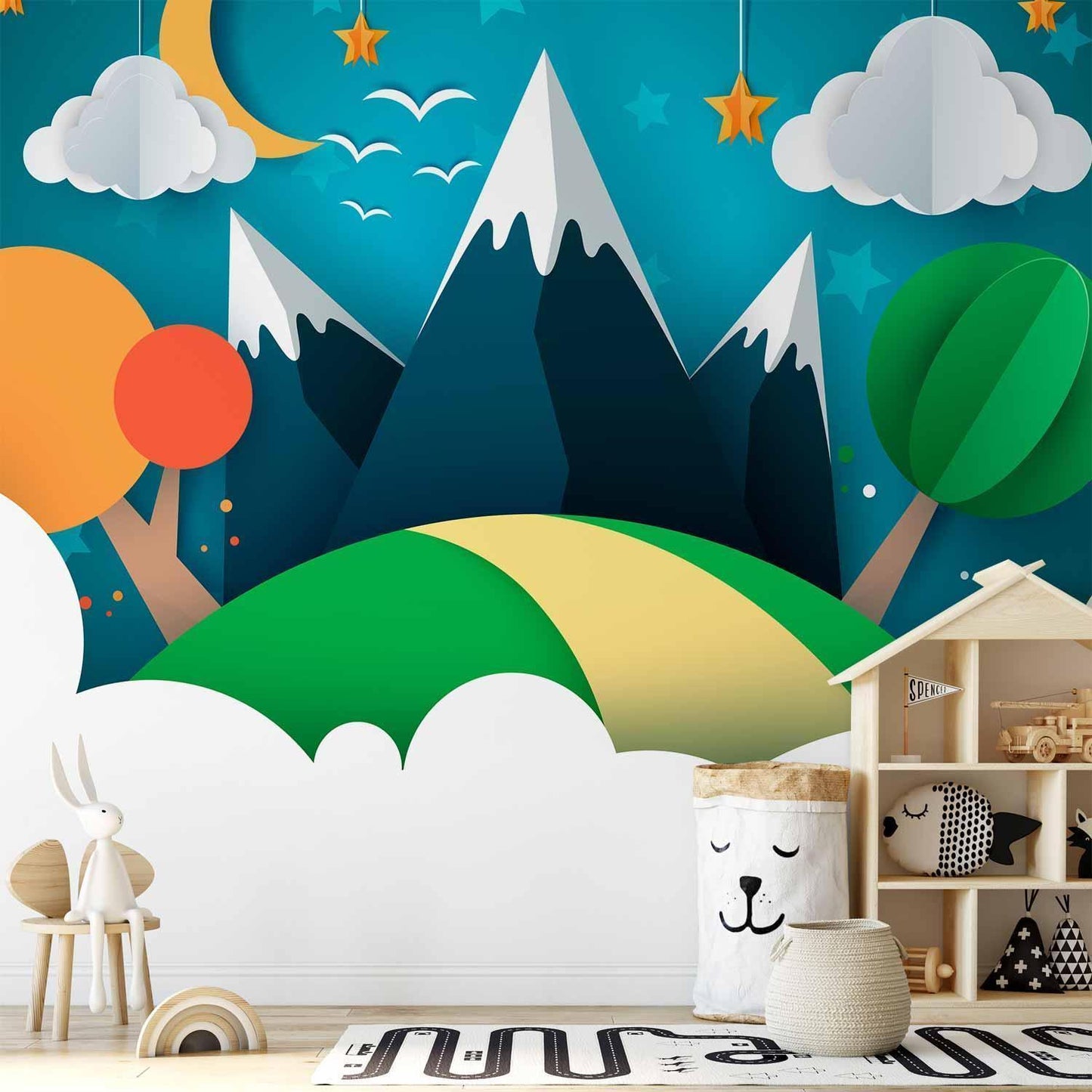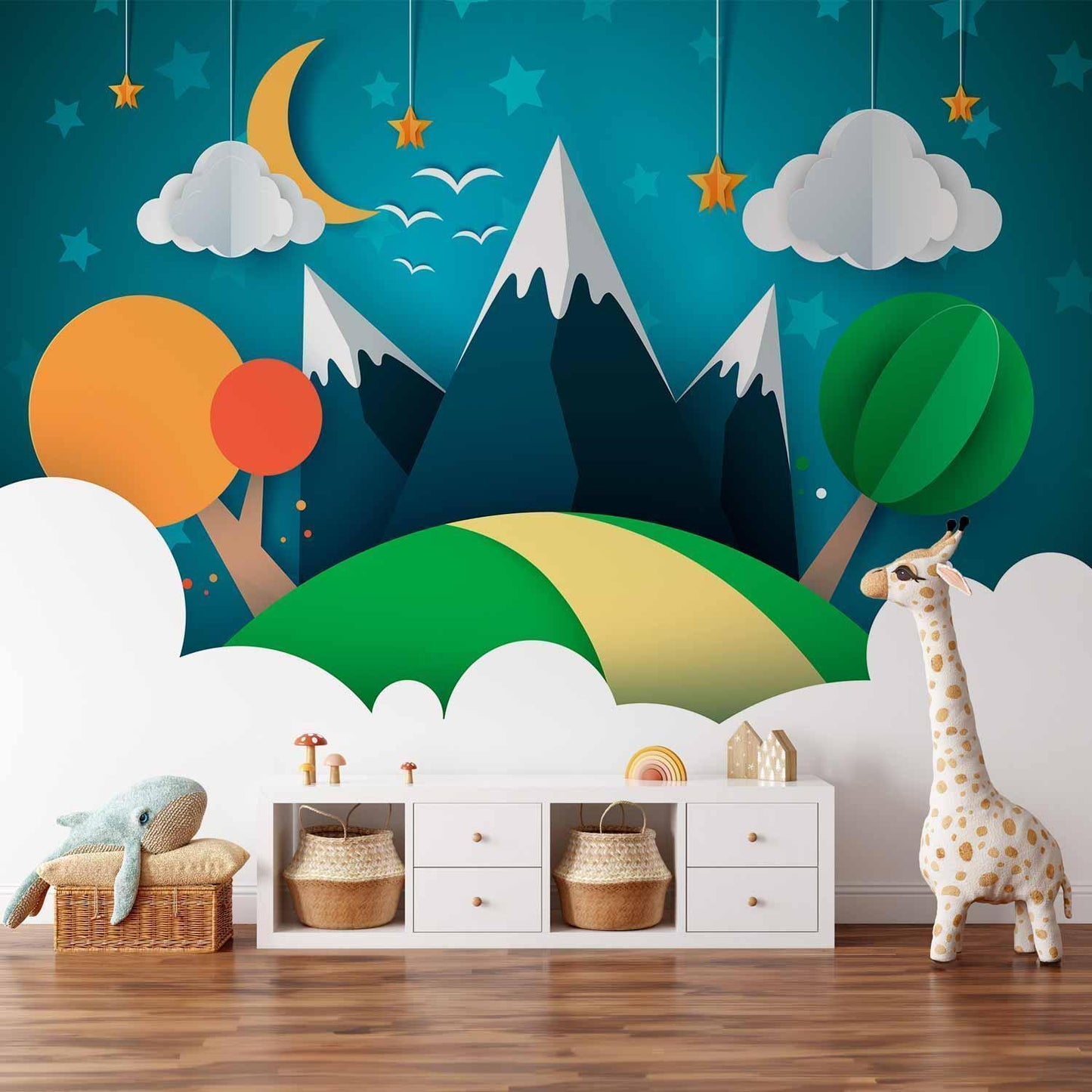 Diese liebevoll gestaltete Fototapete bringt eine ruhige und harmonische Berglandschaft direkt ins Kinderzimmer. Zarte Farben, stilisierte Berge, Bäume und ein beruhigender Himmel mit Sternen und Mond schaffen eine traumhafte Umgebung für kleine Abenteurer.