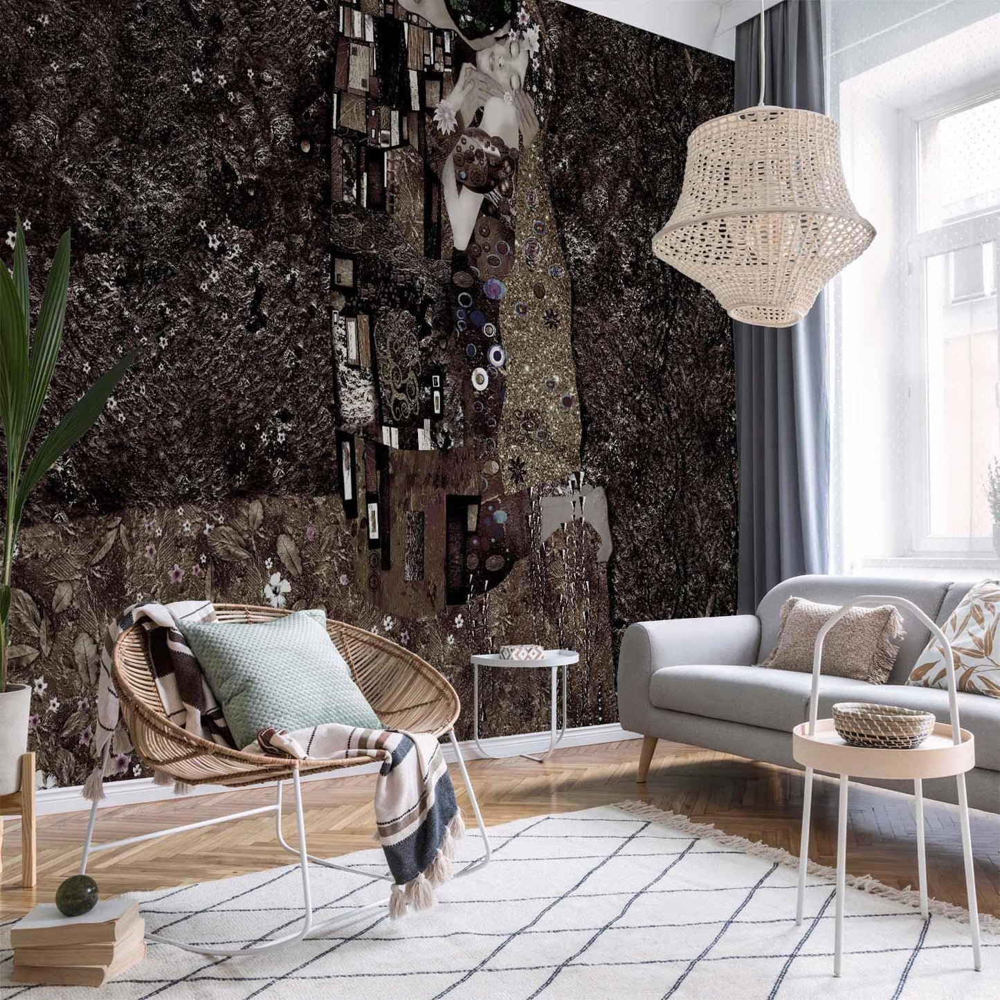 Die Fototapete „Klimt Inspiration – Recalling Tenderness“ ist eine Hommage an den berühmten Jugendstil-Maler Gustav Klimt. Die warmen Gold- und Beigetöne, kombiniert mit zarten, ornamentalen Elementen, schaffen eine luxuriöse und zugleich sanfte Atmosphäre. Diese Wandtapete bringt nicht nur Kunst in dein Zuhause, sondern auch Harmonie und Sinnlichkeit.