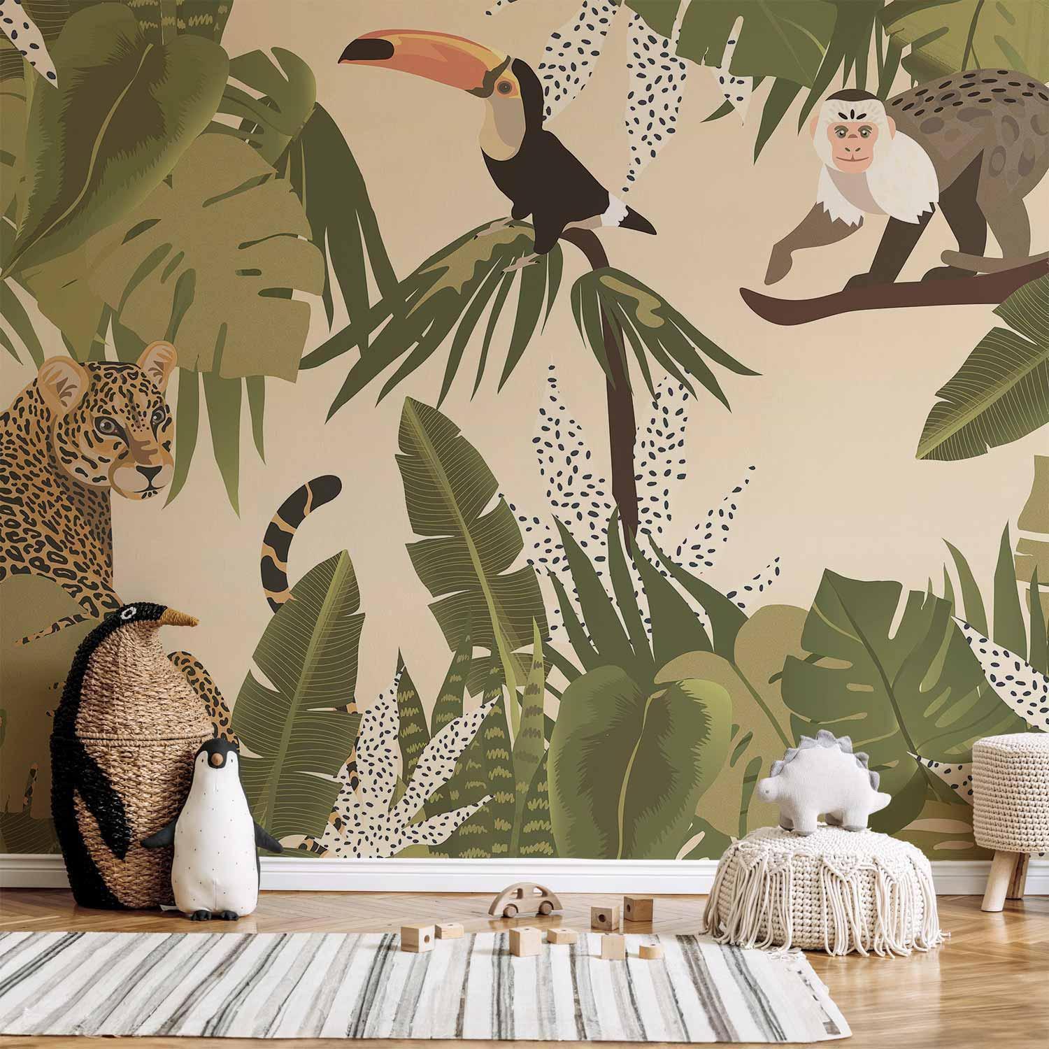Fototapeten sind in den letzten Jahren eine häufige Wahl für Wanddekoration geworden. Sie sind eine großartige Wanddeko, die sich für verschiedene Räume eignet. Fototapeten sind eine hervorragende Alternative für das Wohnzimmer, für das Schlafzimmer und auch für das Kinderzimmer. Diese einzigartigen Dekorationen passen in praktisch jeden Raum. Wenn Sie sich immer noch fragen, ob dies die richtige Wahl ist, sind Sie hier genau richtig. Fototapete "Fototapete - Leaves and Shapes - Jungle in Faded Colours With Animals" wird Ihr Interieur völlig verändern. Hier finden Sie, was Sie brauchen.