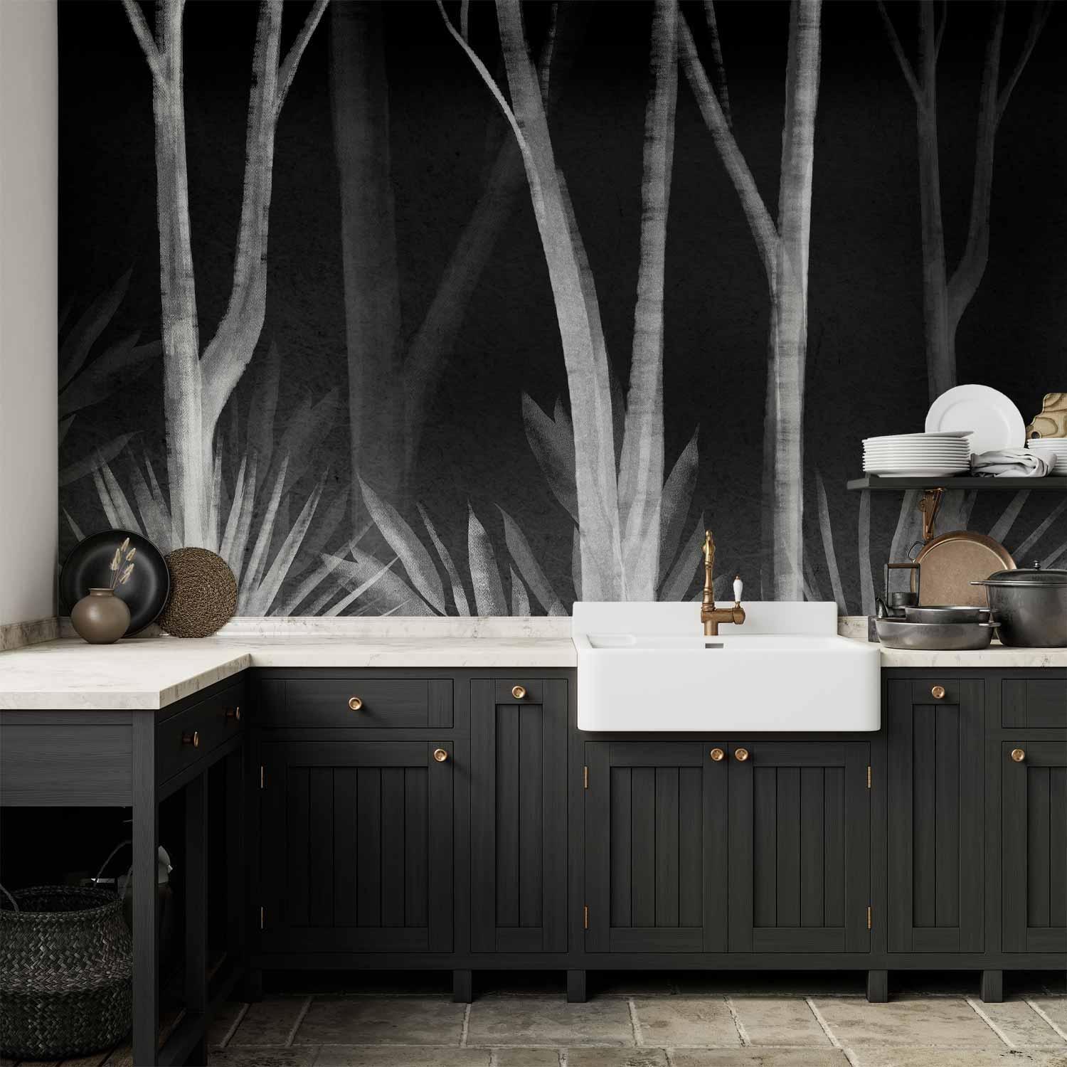 Fototapete "Fototapete - Noise of the forest at night - minimalist landscape of white trees on a black background" ist ein hochwertiger Digitaldruck, der ein qualitativ hochwertiges Produkt und eine einfache Montage garantiert. Fototapete Schlafzimmer ist eine Revolution in der Wandgestaltung. Wählen Sie das passende Universalmotiv für Ihr Schlafzimmer und genießen Sie jede Nacht einen einzigartigen Ausblick. Sie können die Größe der Dekoration an Ihre räumlichen Gegebenheiten anpassen. Außerdem können Sie das Material und die zusätzlichen Effekte wählen, die auf der Fototapete Schlafzimmer zu sehen sind. Ähnliche Motive, die Sie im Schlafzimmer verwenden, können auch in der Küche eingesetzt werden. Die Fototapete Küche eignet sich auch gut für das Schlafzimmer und das Wohnzimmer. Sie können Ihre Wanddekoration nach Belieben konfigurieren und sie so anpassen, dass sie perfekt in jeden Raum passt.