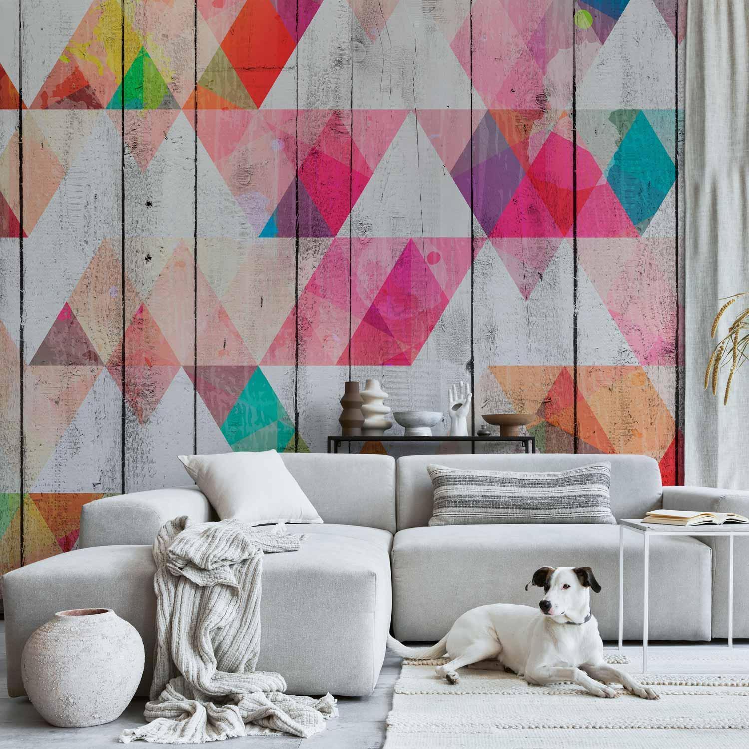 Die kräftigen Farben verleihen dem Raum Energie und Lebendigkeit. Gleichzeitig bleibt das Motiv durch seine geometrische Struktur klar und strukturiert – eine perfekte Balance zwischen Ausdruck und Ordnung. Ob als Akzentwand oder für den ganzen Raum: Diese geometrische Fototapete passt hervorragend zu modernen, minimalistischen und kreativen Einrichtungsstilen.