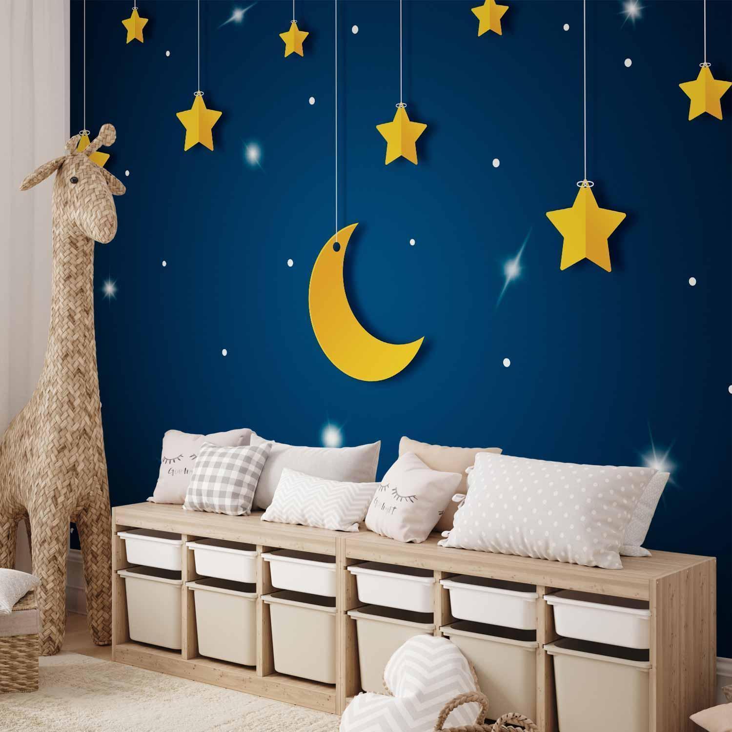 Fototapete "Fototapete - Skyline - night sky landscape with stars and moon for children" ist ein hochwertiger Digitaldruck, der ein qualitativ hochwertiges Produkt und eine einfache Montage garantiert. Fototapete Schlafzimmer ist eine Revolution in der Wandgestaltung. Wählen Sie das passende Universalmotiv für Ihr Schlafzimmer und genießen Sie jede Nacht einen einzigartigen Ausblick. Sie können die Größe der Dekoration an Ihre räumlichen Gegebenheiten anpassen. Außerdem können Sie das Material und die zusätzlichen Effekte wählen, die auf der Fototapete Schlafzimmer zu sehen sind. Ähnliche Motive, die Sie im Schlafzimmer verwenden, können auch in der Küche eingesetzt werden. Die Fototapete Küche eignet sich auch gut für das Schlafzimmer und das Wohnzimmer. Sie können Ihre Wanddekoration nach Belieben konfigurieren und sie so anpassen, dass sie perfekt in jeden Raum passt.