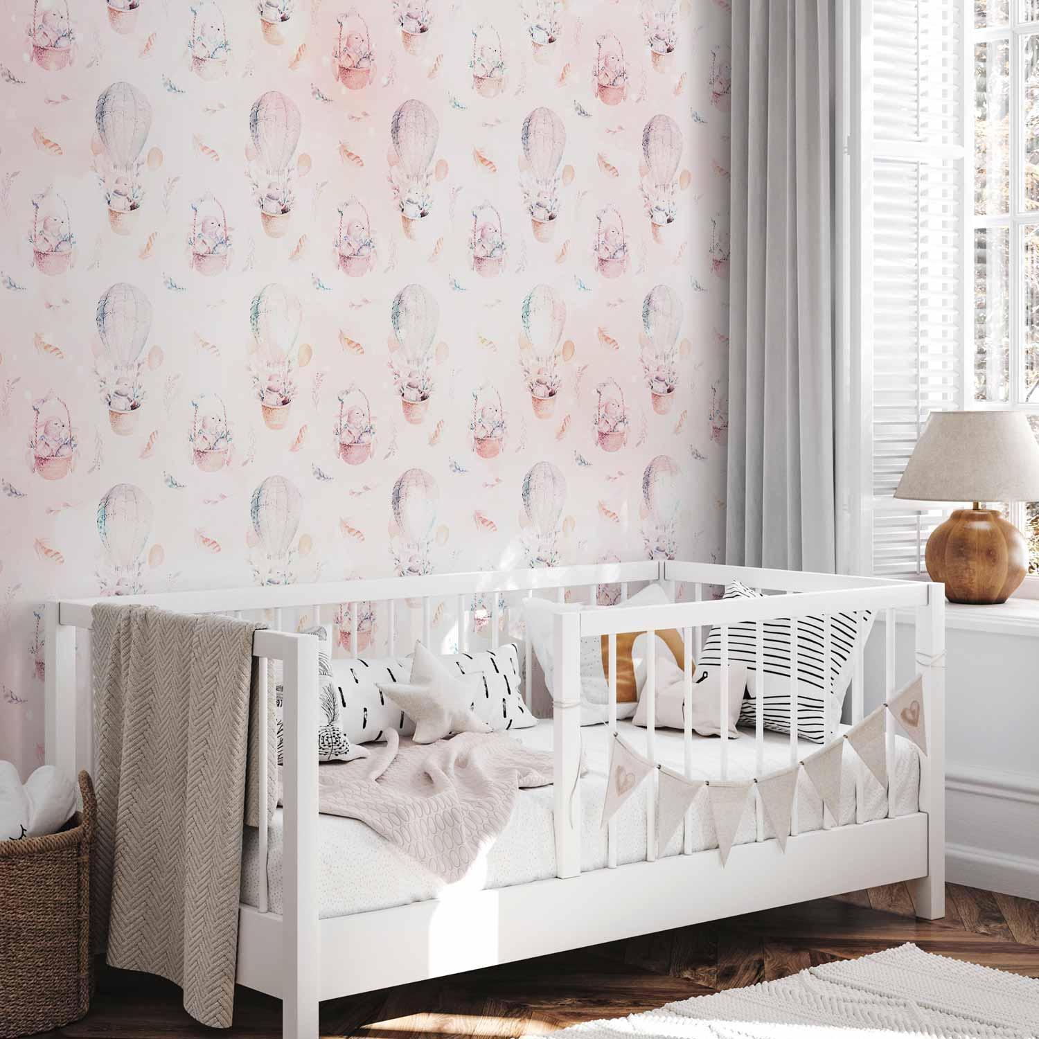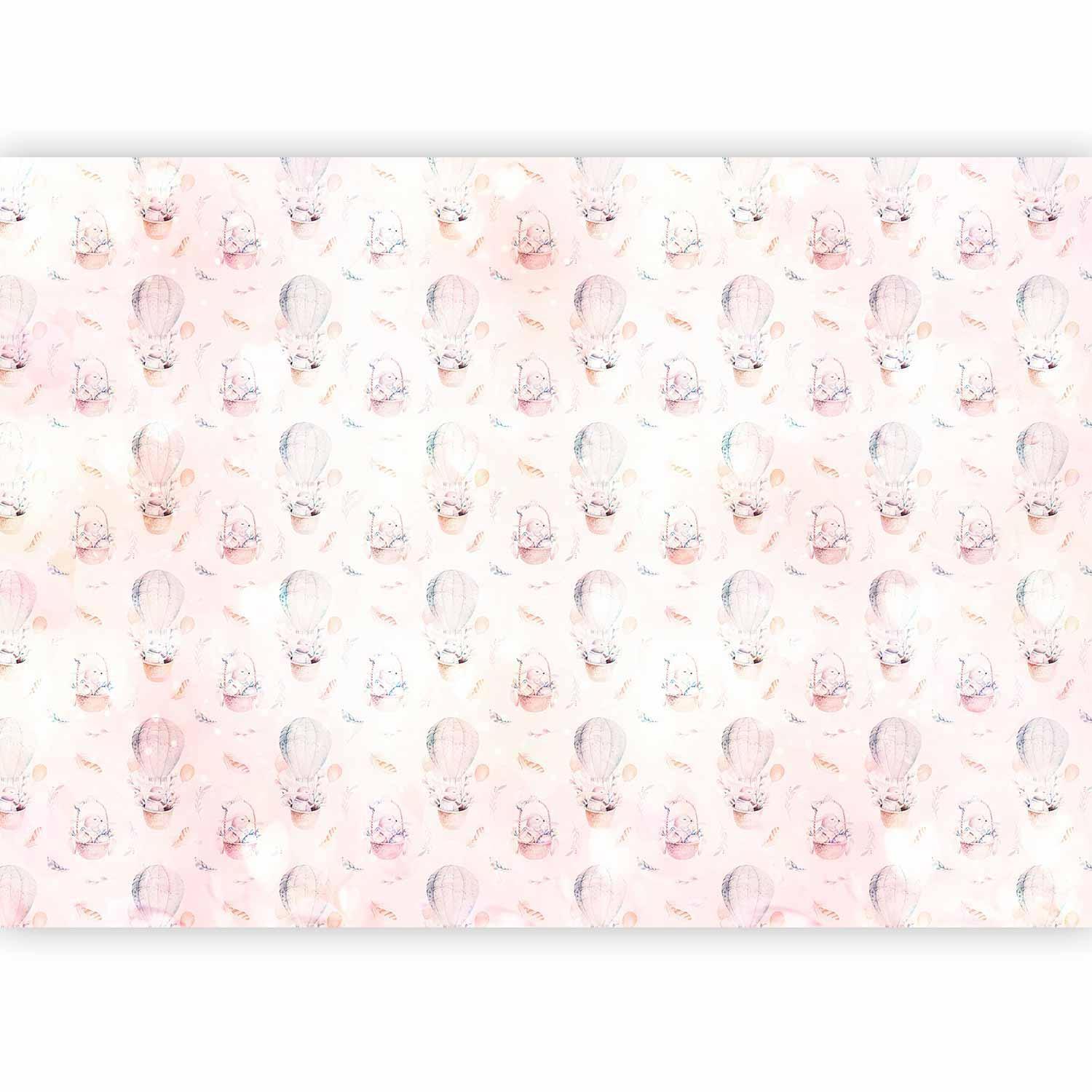 Fototapete - Solid pattern with feathers - hares in a basket and in a balloon for children