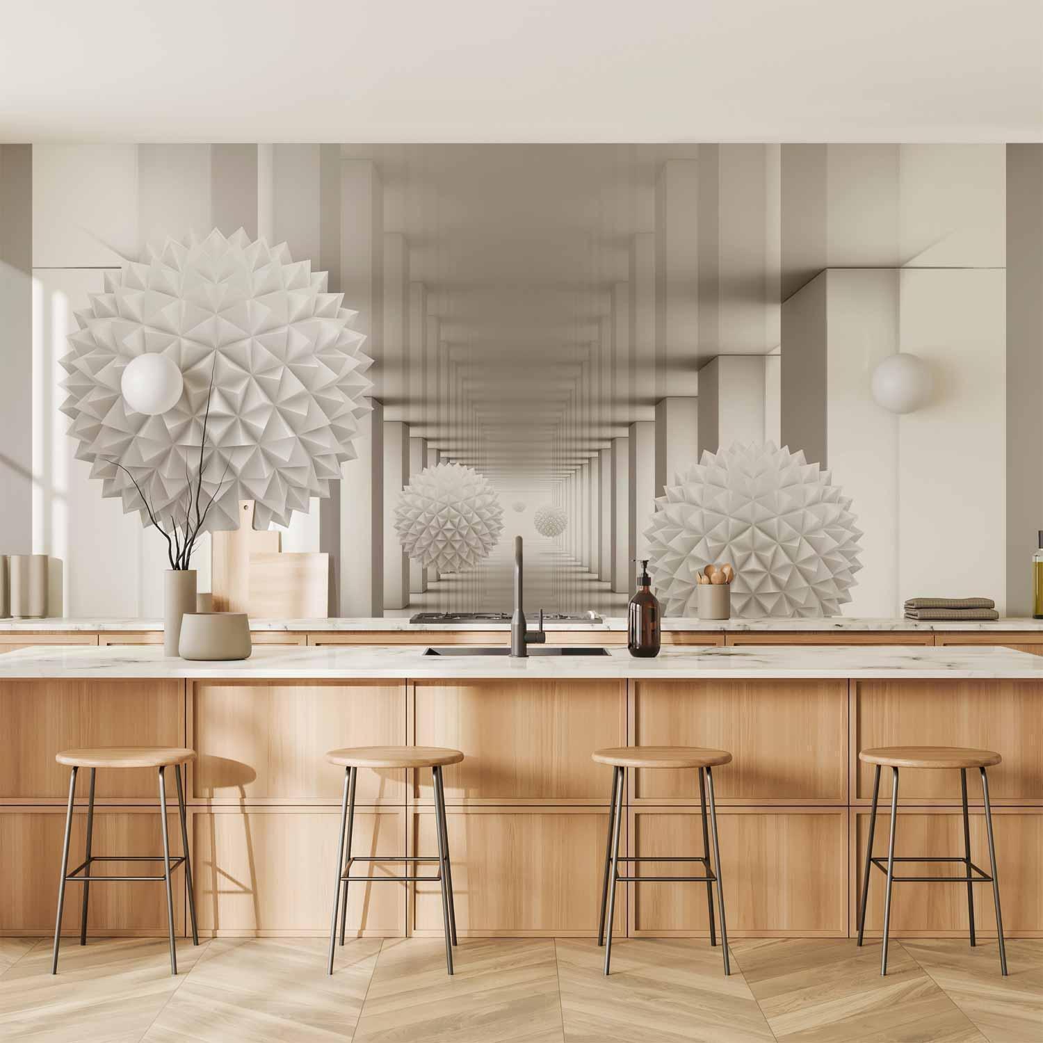 Diese hochwertige Fototapete spielt meisterhaft mit Perspektive und Licht. Der dreidimensionale Effekt zieht den Blick in die Tiefe und lässt selbst kleine Räume größer wirken. Die klare weiße Farbgebung kombiniert mit der geometrischen Präzision schafft eine puristische, futuristische Atmosphäre – ideal für Räume mit Wow-Faktor.