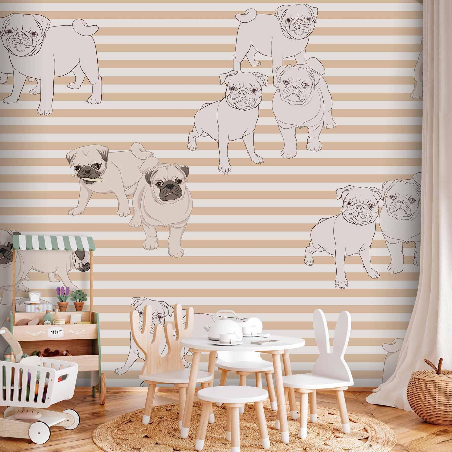 Diese liebevoll gestaltete Fototapete zeigt verspielte Hunde in charmanten Posen – ein echtes Highlight für Kinderzimmer, Spielzimmer oder das Zuhause von Tierliebhabern. Mit einem modernen, aber verspielten Look bringt sie Leichtigkeit und Freude in jeden Raum.