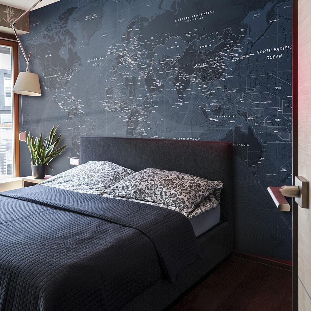 Dank ihres zeitlosen und bildenden Designs passt die Wandtapete Weltkarte in Blau perfekt in verschiedene Wohnbereiche. Ideal als inspirierende Akzentwand im Arbeitszimmer, zur Schaffung einer weltoffenen Atmosphäre im Wohnzimmer oder als lehrreicher Hintergrund im Kinderzimmer. Sie harmoniert hervorragend mit Möbeln in hellen Holztönen, Weiß-, Grau- und natürlichen Beigetönen. Besonders schön wirkt sie mit modernen Materialien wie Glas, Metall, klaren Linien und geografischen Accessoires sowie mit Reiseerinnerungen und Büchern.