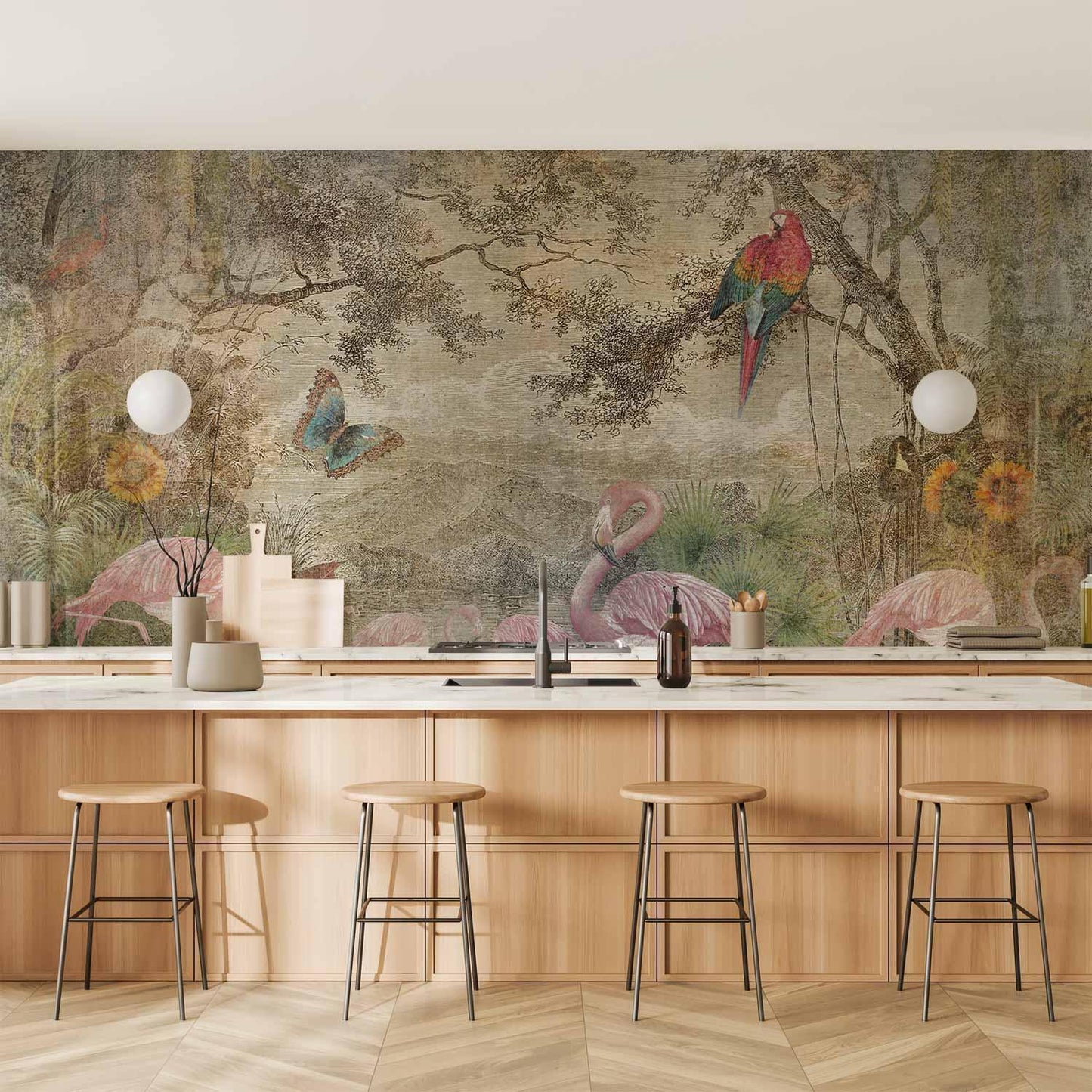 Dank ihres lebendigen und exotischen Designs passt die Wandtapete Wilde Fauna und Flora perfekt in verschiedene Wohnbereiche. Ideal als beeindruckende Akzentwand im Wohnzimmer, zur Schaffung einer abenteuerlichen Atmosphäre im Kinderzimmer oder als inspirierender Hintergrund im Arbeitszimmer. Sie harmoniert hervorragend mit Möbeln in dunklen Holztönen, Natur-, Braun- und warmen Erdtönen. Besonders schön wirkt sie mit natürlichen Materialien wie Rattan, Bambus, Leinen und Jute sowie mit exotischen Pflanzen und Safari-Accessoires.