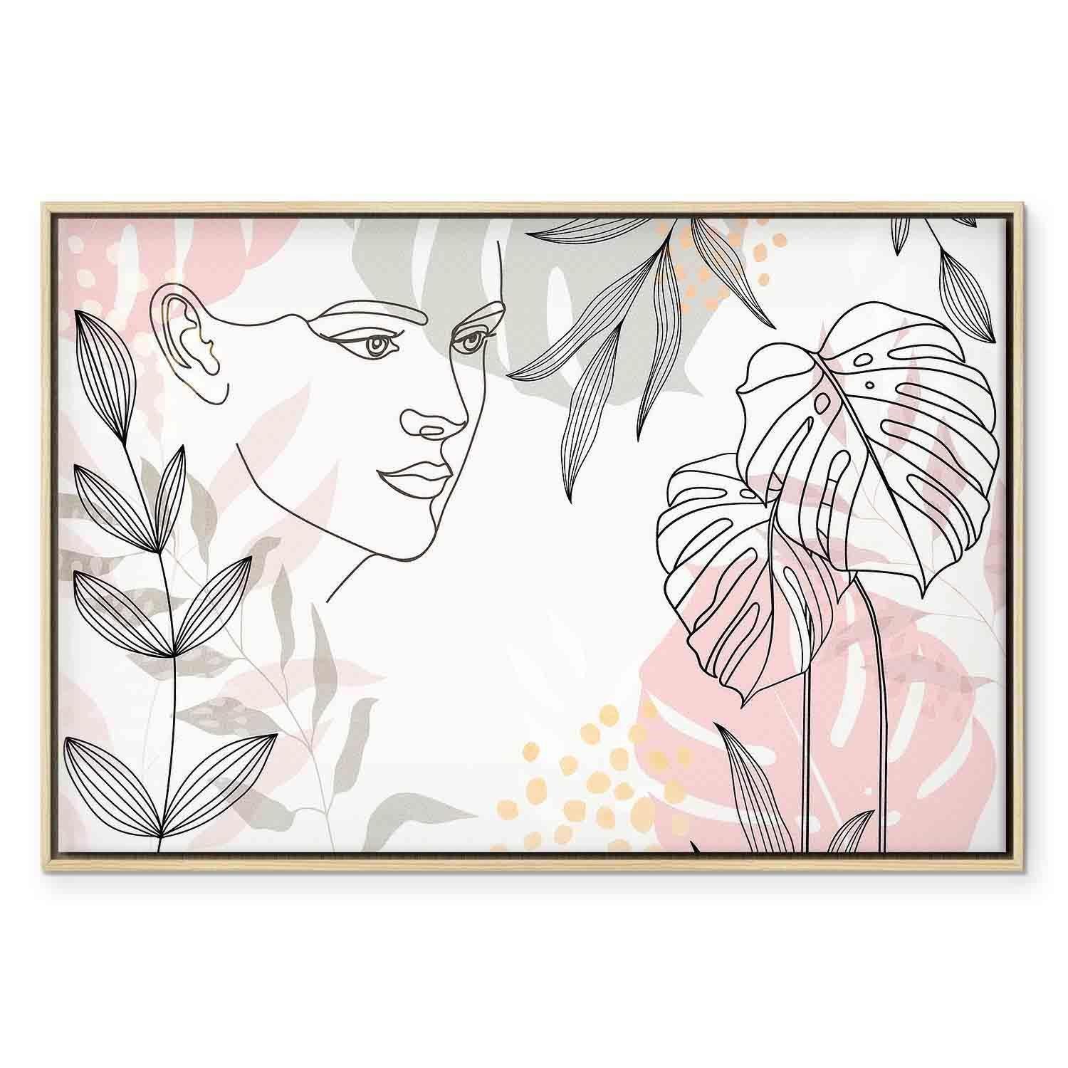 Leinwandbild Frau mit Monstera Blättern – Moderne Line Art