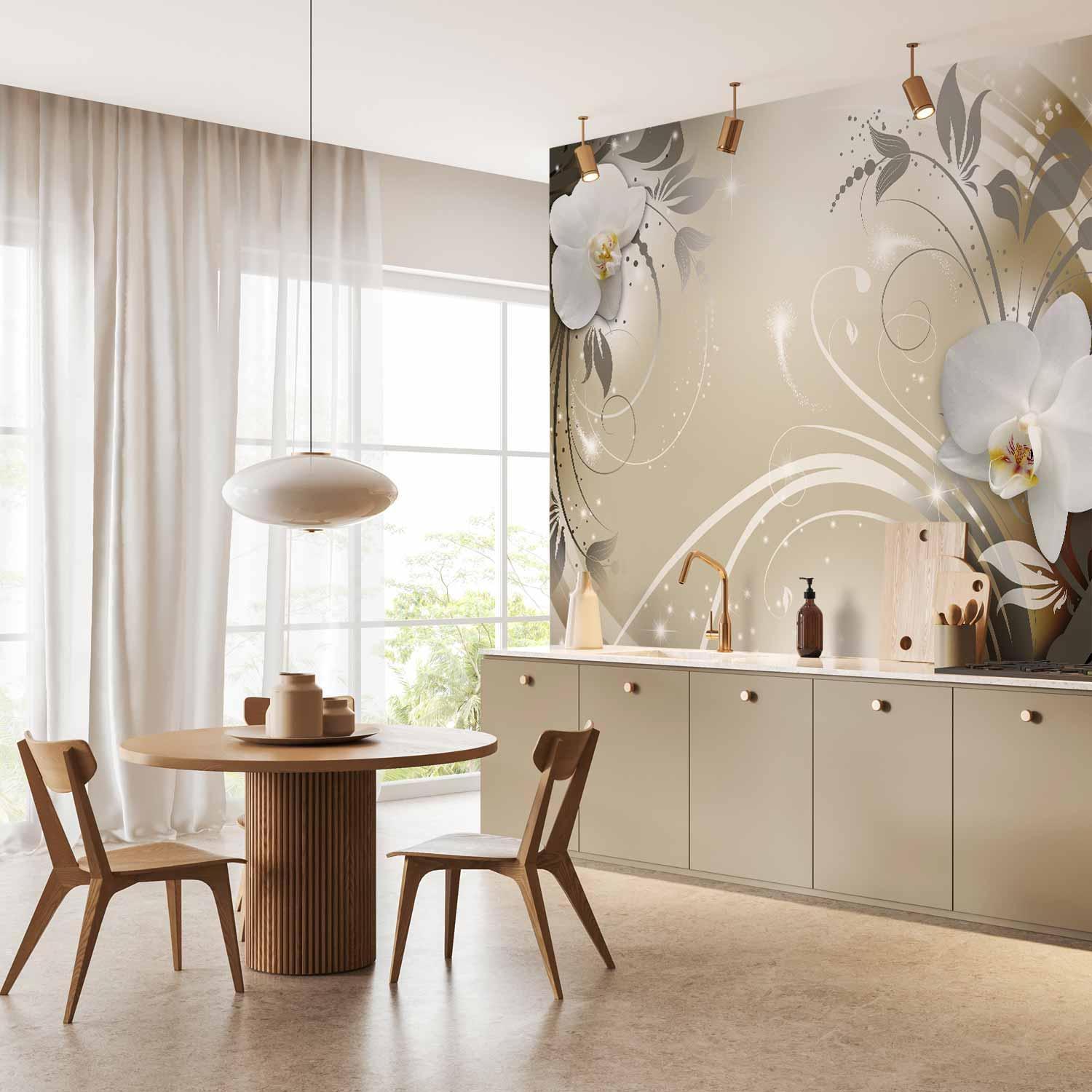 Mit der Fototapete „Goldene Orchideen - Elegante Blütenpracht mit Goldakzenten" holst du dir die edle Schönheit von Orchideen direkt an deine Wand. Die eleganten weißen Orchideenblüten auf beige-goldenem Hintergrund schaffen eine luxuriöse, stilvolle Atmosphäre – perfekt für alle, die florale Eleganz und edle Akzente lieben.
