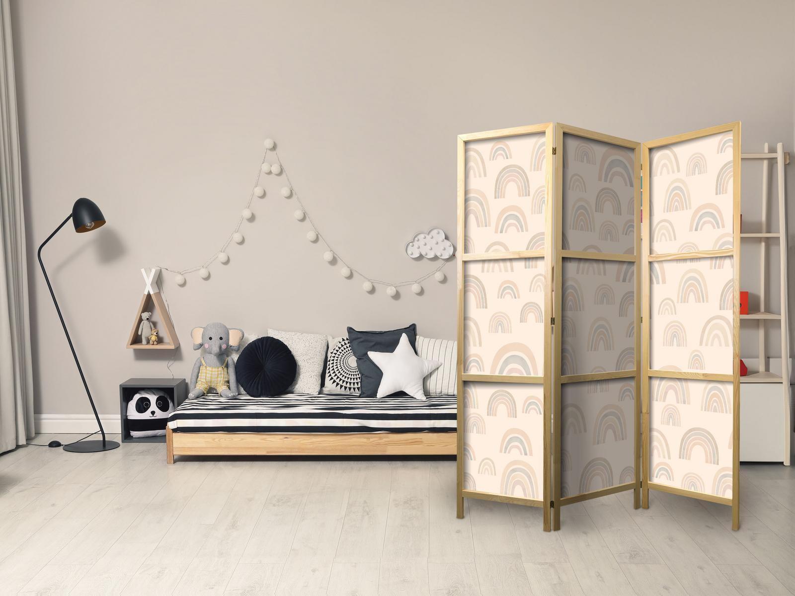 Die asiatischen Paravents aus unserer Kollektion werden auf hochwertiges Vlies gedruckt. Dank des Materials hat sich der sichere Paravent auch im Zimmer eines jungen Orient-Liebhaber bewährt. Asiatische Paravents sind perfekt für ein Restaurant in diesem Stil. Sie können die Bereiche zwischen den Tischen abgrenzen, so dass sich die Gäste wohlfühlen. Japanisches Paravent "Japanischer Paravent - August Sky - Rainbows of Various Sizes in Muted Colors." ist auch eine gute Option für Schönheitssalons. Wenn Sie keine Wände bauen wollen, deren Layout Sie nach einer gewissen Zeit langweilen könnte, ist ein japanischer Paravent ideal für Sie! Es trennt die Kundenbereiche und verleiht ihnen Intimität.Details zur Produktsicherheit