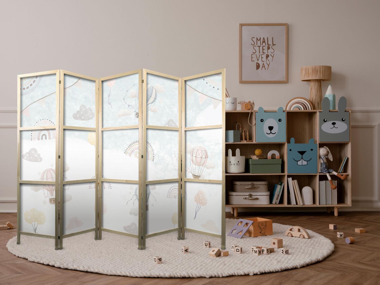 Die asiatischen Paravents aus unserer Kollektion werden auf hochwertiges Vlies gedruckt. Dank des Materials hat sich der sichere Paravent auch im Zimmer eines jungen Orient-Liebhaber bewährt. Asiatische Paravents sind perfekt für ein Restaurant in diesem Stil. Sie können die Bereiche zwischen den Tischen abgrenzen, so dass sich die Gäste wohlfühlen. Japanisches Paravent "Japanischer Paravent - Balloons in the Sky - Balloons in pastel colors flying through a cloudy sky - among rainbows and stars." ist auch eine gute Option für Schönheitssalons. Wenn Sie keine Wände bauen wollen, deren Layout Sie nach einer gewissen Zeit langweilen könnte, ist ein japanischer Paravent ideal für Sie! Es trennt die Kundenbereiche und verleiht ihnen Intimität.Details zur Produktsicherheit