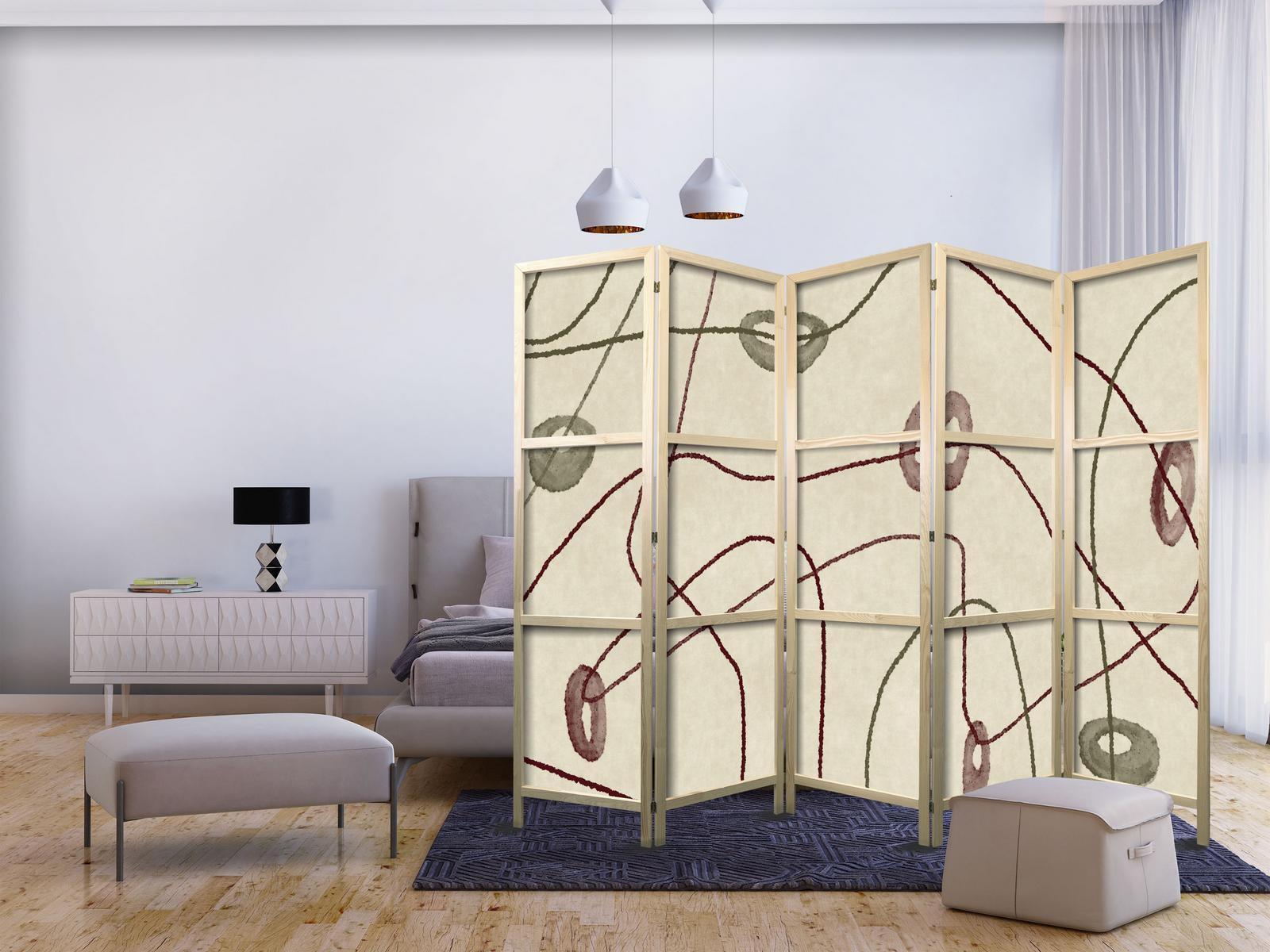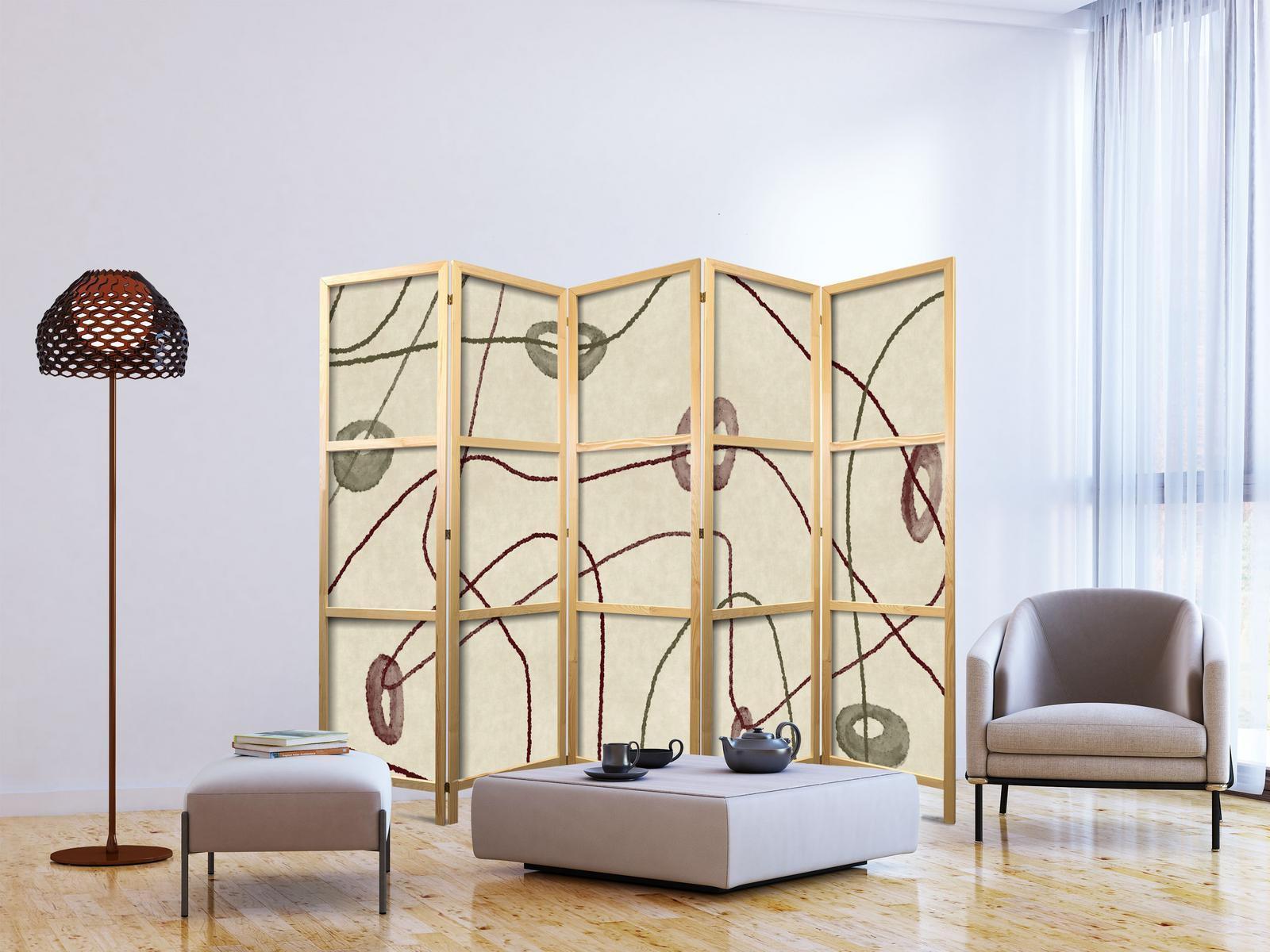 Liegen Ihnen der japanische Stil und die japanische Kultur am Herzen? Aber nicht nahe genug, um dort zu leben oder diesen Teil der Welt zu besuchen? Sind Sie auf der Suche nach einer modernen Dekoration für Ihr Zuhause? Sehen Sie sich die japanischen Paravents an. Dieses vergessene dekorative Element ist sowohl zu Hause als auch im Büro sehr nützlich. Für wenig Geld können Sie Ihre Wohnung fast wie neu einrichten. Japanische Paravents fügen sich perfekt in jeden Einrichtungsstil ein. Ein Paravent "Japanischer Paravent - Bead Labyrinth - Minimalist Abstraction on a Worn Background" ist nicht nur eine tolle Dekorationsidee, sondern auch eine praktische Möglichkeit, für Privatsphäre zu sorgen. Müssen Sie aus Ihrem Wohnzimmer zwei Räume machen? Ein japanischer Paravent ist in einem solchen Fall die ideale Lösung. Darüber hinaus unterstreicht das einseitig aufgedruckte Motiv mit Bezug zu Japan Ihr Interesse an der orientalischen Kultur. Wenn Sie in einer Einzimmerwohnung leben, ist japanischer Paravent eine gute Lösung, um die verschiedenen Bereiche voneinander zu trennen. Auf diese Weise schaffen Sie definierte Bereiche für das Esszimmer oder das Wohnzimmer oder sogar trennen Ihre Home-Office-Ecke ab und nutzen ein schönes Objekt, das viel Charme in Ihr Interieur bringt.