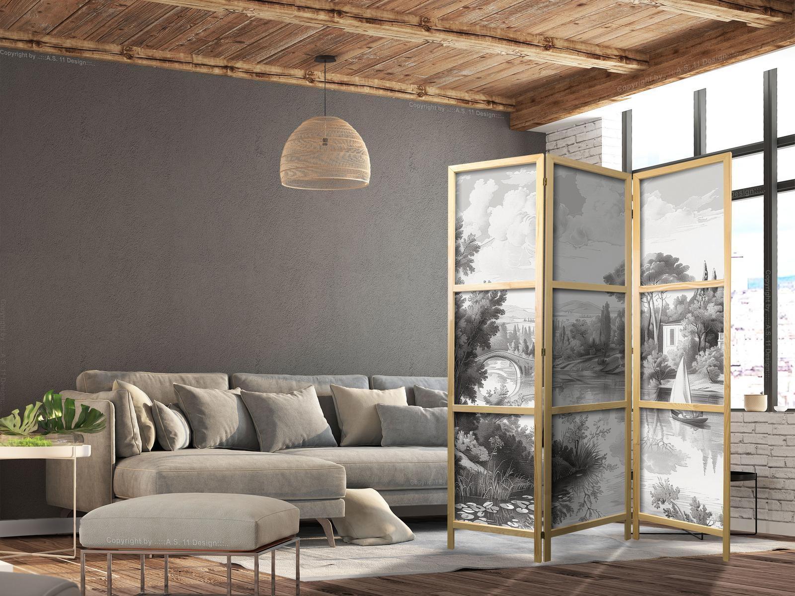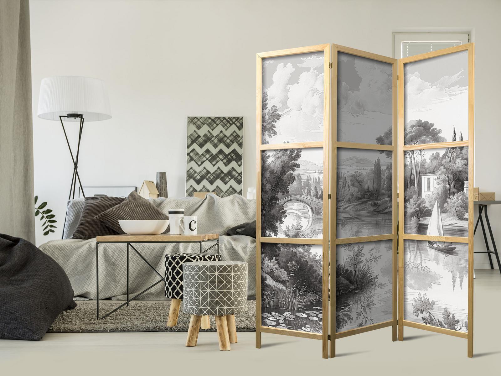 Liegen Ihnen der japanische Stil und die japanische Kultur am Herzen? Aber nicht nahe genug, um dort zu leben oder diesen Teil der Welt zu besuchen? Sind Sie auf der Suche nach einer modernen Dekoration für Ihr Zuhause? Sehen Sie sich die japanischen Paravents an. Dieses vergessene dekorative Element ist sowohl zu Hause als auch im Büro sehr nützlich. Für wenig Geld können Sie Ihre Wohnung fast wie neu einrichten. Japanische Paravents fügen sich perfekt in jeden Einrichtungsstil ein. Ein Paravent "Japanischer Paravent - Black and White Vintage Landscape - Retro View of a Pond with a Boat." ist nicht nur eine tolle Dekorationsidee, sondern auch eine praktische Möglichkeit, für Privatsphäre zu sorgen. Müssen Sie aus Ihrem Wohnzimmer zwei Räume machen? Ein japanischer Paravent ist in einem solchen Fall die ideale Lösung. Darüber hinaus unterstreicht das einseitig aufgedruckte Motiv mit Bezug zu Japan Ihr Interesse an der orientalischen Kultur. Wenn Sie in einer Einzimmerwohnung leben, ist japanischer Paravent eine gute Lösung, um die verschiedenen Bereiche voneinander zu trennen. Auf diese Weise schaffen Sie definierte Bereiche für das Esszimmer oder das Wohnzimmer oder sogar trennen Ihre Home-Office-Ecke ab und nutzen ein schönes Objekt, das viel Charme in Ihr Interieur bringt.