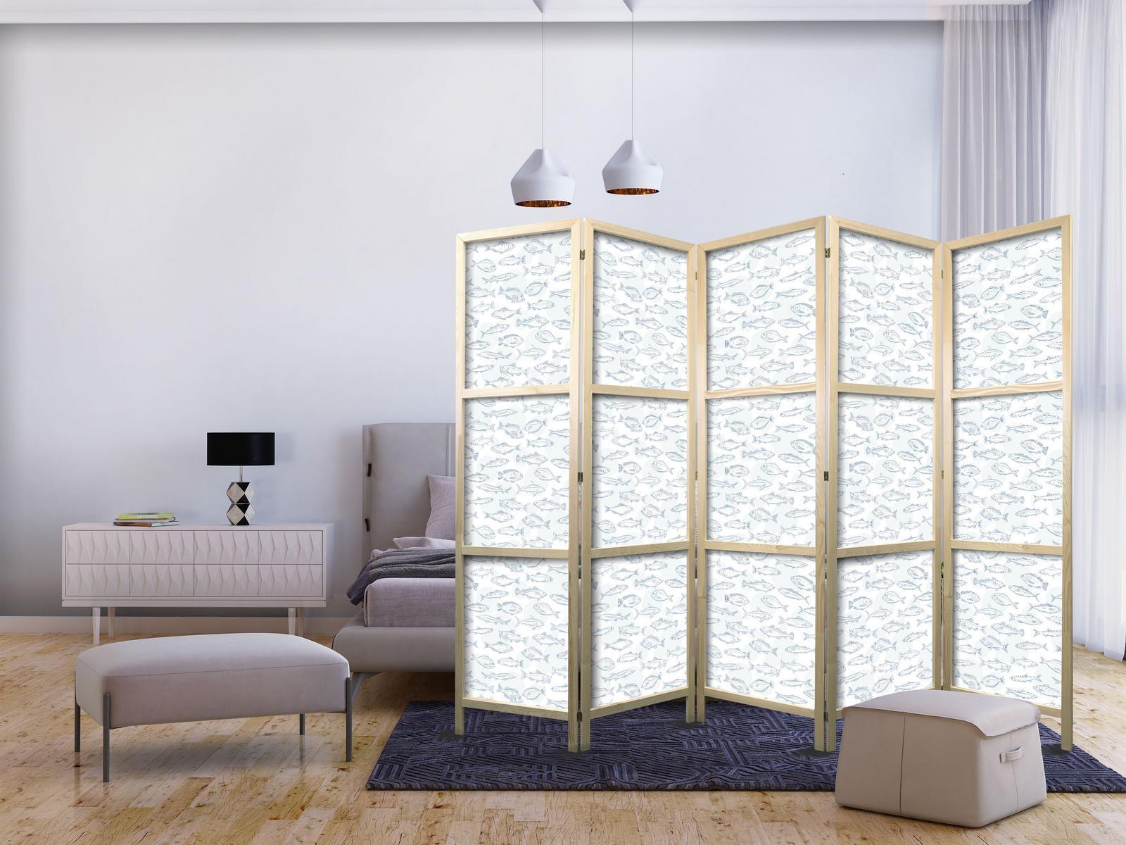 Liegen Ihnen der japanische Stil und die japanische Kultur am Herzen? Aber nicht nahe genug, um dort zu leben oder diesen Teil der Welt zu besuchen? Sind Sie auf der Suche nach einer modernen Dekoration für Ihr Zuhause? Sehen Sie sich die japanischen Paravents an. Dieses vergessene dekorative Element ist sowohl zu Hause als auch im Büro sehr nützlich. Für wenig Geld können Sie Ihre Wohnung fast wie neu einrichten. Japanische Paravents fügen sich perfekt in jeden Einrichtungsstil ein. Ein Paravent "Japanischer Paravent - Blue Fish - Blue Outlines of Various Species of Fish on a White-Blue Background" ist nicht nur eine tolle Dekorationsidee, sondern auch eine praktische Möglichkeit, für Privatsphäre zu sorgen. Müssen Sie aus Ihrem Wohnzimmer zwei Räume machen? Ein japanischer Paravent ist in einem solchen Fall die ideale Lösung. Darüber hinaus unterstreicht das einseitig aufgedruckte Motiv mit Bezug zu Japan Ihr Interesse an der orientalischen Kultur. Wenn Sie in einer Einzimmerwohnung leben, ist japanischer Paravent eine gute Lösung, um die verschiedenen Bereiche voneinander zu trennen. Auf diese Weise schaffen Sie definierte Bereiche für das Esszimmer oder das Wohnzimmer oder sogar trennen Ihre Home-Office-Ecke ab und nutzen ein schönes Objekt, das viel Charme in Ihr Interieur bringt.