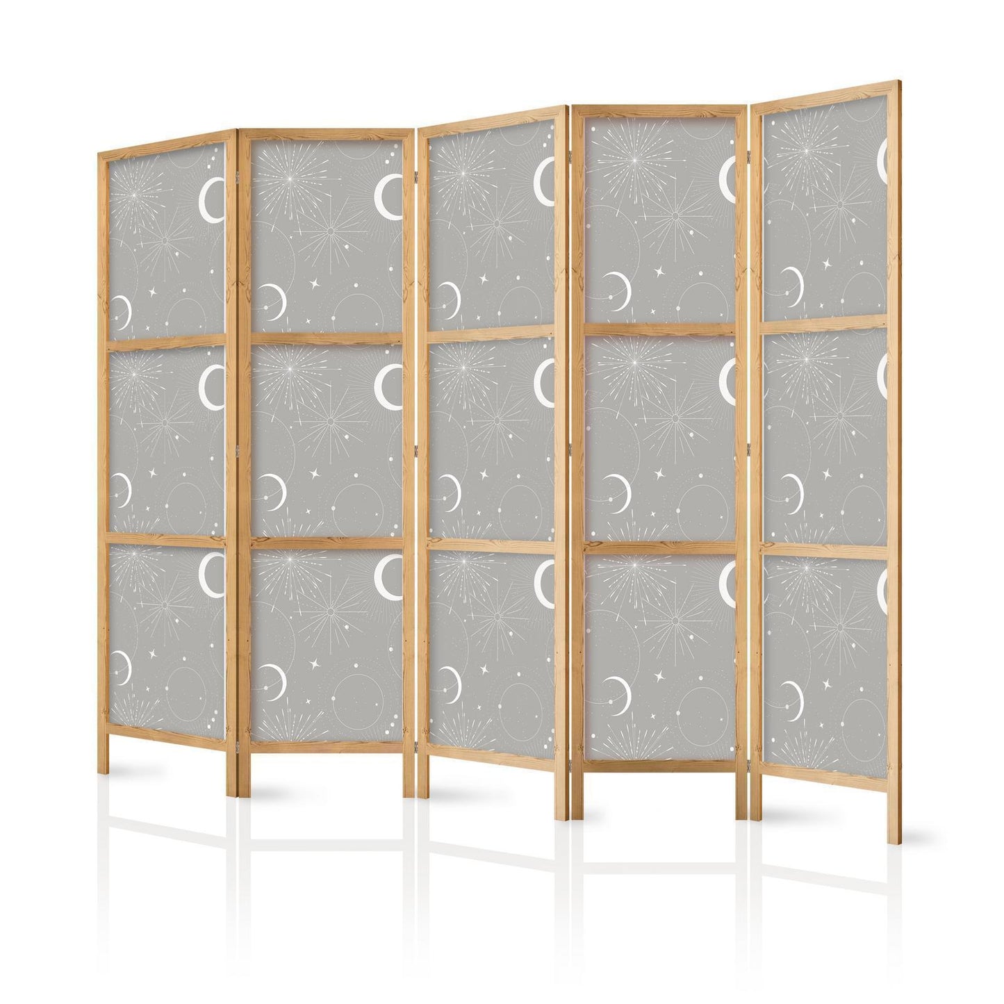 Japanischer Paravent - Cosmic Fireworks - Elegant Pattern with Moons and Stars on a Gray Background