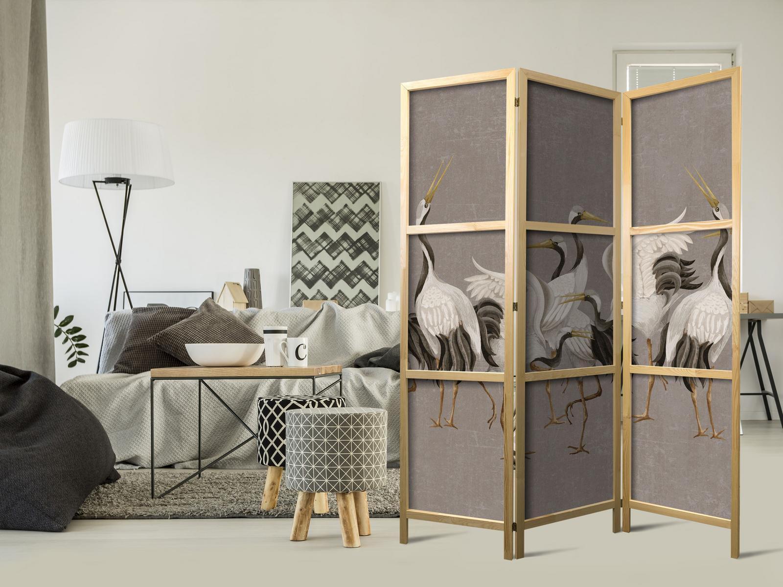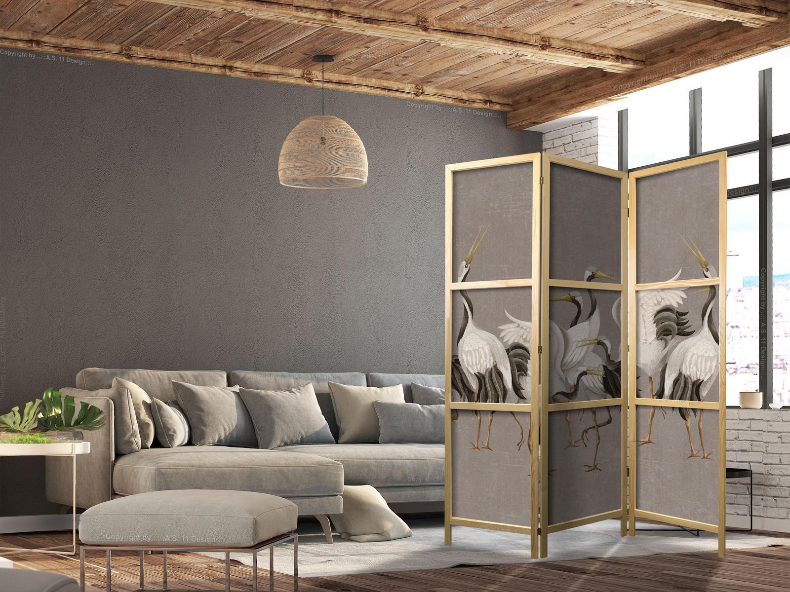 Japanischer Paravent "Japanischer Paravent - Crane dance - bright silhouettes of birds on a warm grey background with texture"