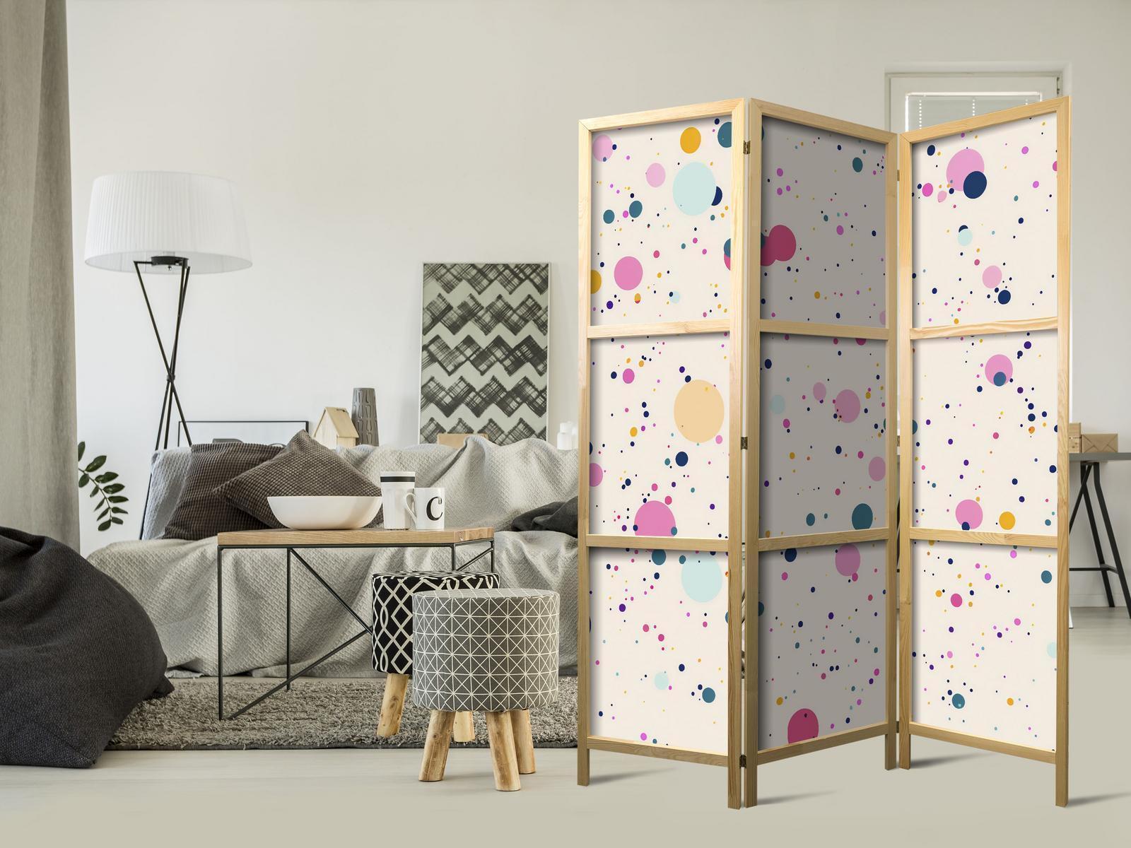 Liegen Ihnen der japanische Stil und die japanische Kultur am Herzen? Aber nicht nahe genug, um dort zu leben oder diesen Teil der Welt zu besuchen? Sind Sie auf der Suche nach einer modernen Dekoration für Ihr Zuhause? Sehen Sie sich die japanischen Paravents an. Dieses vergessene dekorative Element ist sowohl zu Hause als auch im Büro sehr nützlich. Für wenig Geld können Sie Ihre Wohnung fast wie neu einrichten. Japanische Paravents fügen sich perfekt in jeden Einrichtungsstil ein. Ein Paravent "Japanischer Paravent - Dots - Spots and Splashes Multicolored - Cheerful Pattern on a Light Pink Background." ist nicht nur eine tolle Dekorationsidee, sondern auch eine praktische Möglichkeit, für Privatsphäre zu sorgen. Müssen Sie aus Ihrem Wohnzimmer zwei Räume machen? Ein japanischer Paravent ist in einem solchen Fall die ideale Lösung. Darüber hinaus unterstreicht das einseitig aufgedruckte Motiv mit Bezug zu Japan Ihr Interesse an der orientalischen Kultur. Wenn Sie in einer Einzimmerwohnung leben, ist japanischer Paravent eine gute Lösung, um die verschiedenen Bereiche voneinander zu trennen. Auf diese Weise schaffen Sie definierte Bereiche für das Esszimmer oder das Wohnzimmer oder sogar trennen Ihre Home-Office-Ecke ab und nutzen ein schönes Objekt, das viel Charme in Ihr Interieur bringt.