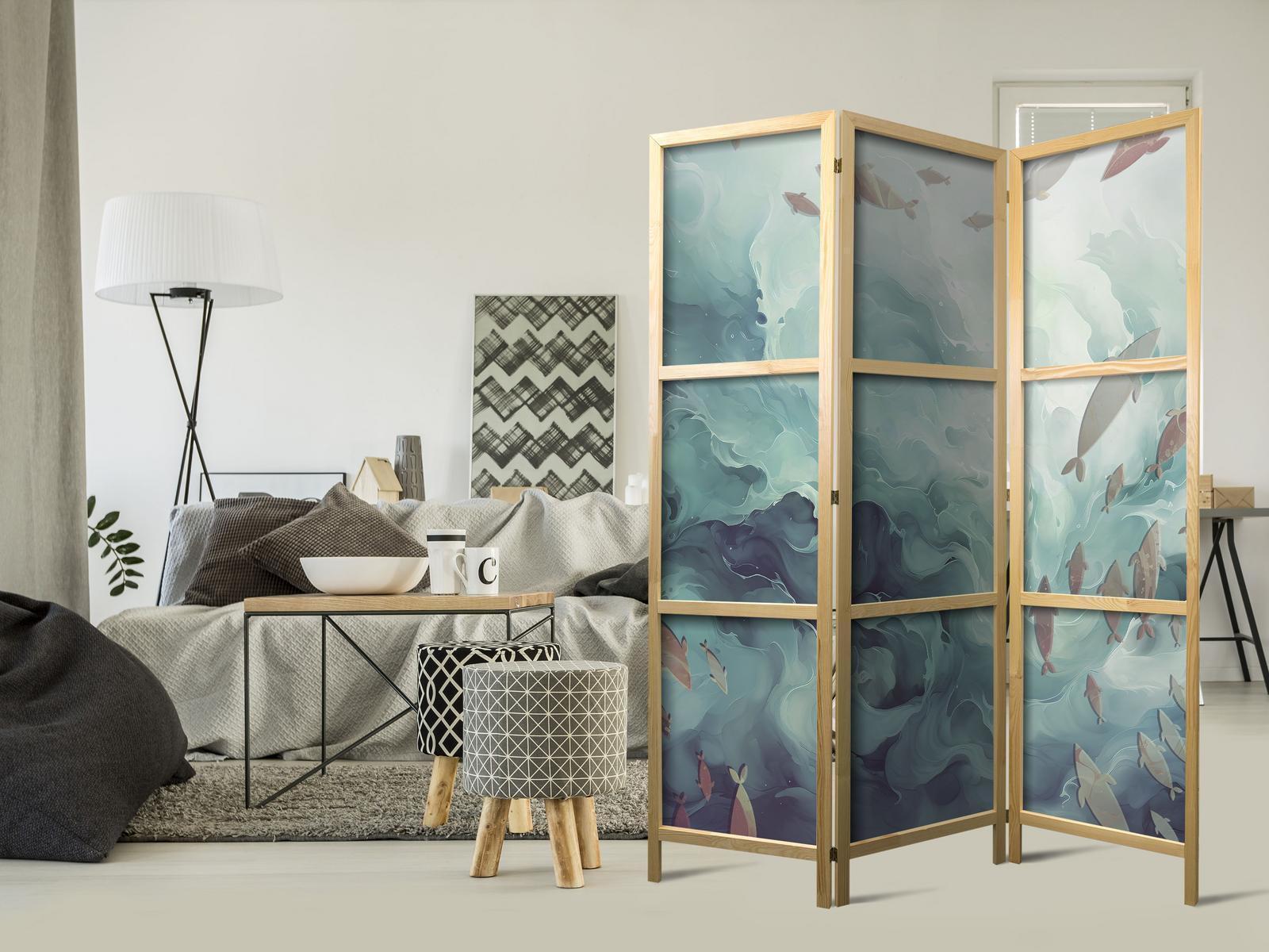 Japanischer Paravent "Japanischer Paravent - Escaping Fish - Very Fast Swimming Fish in Muted Colors Among Ocean Depths"