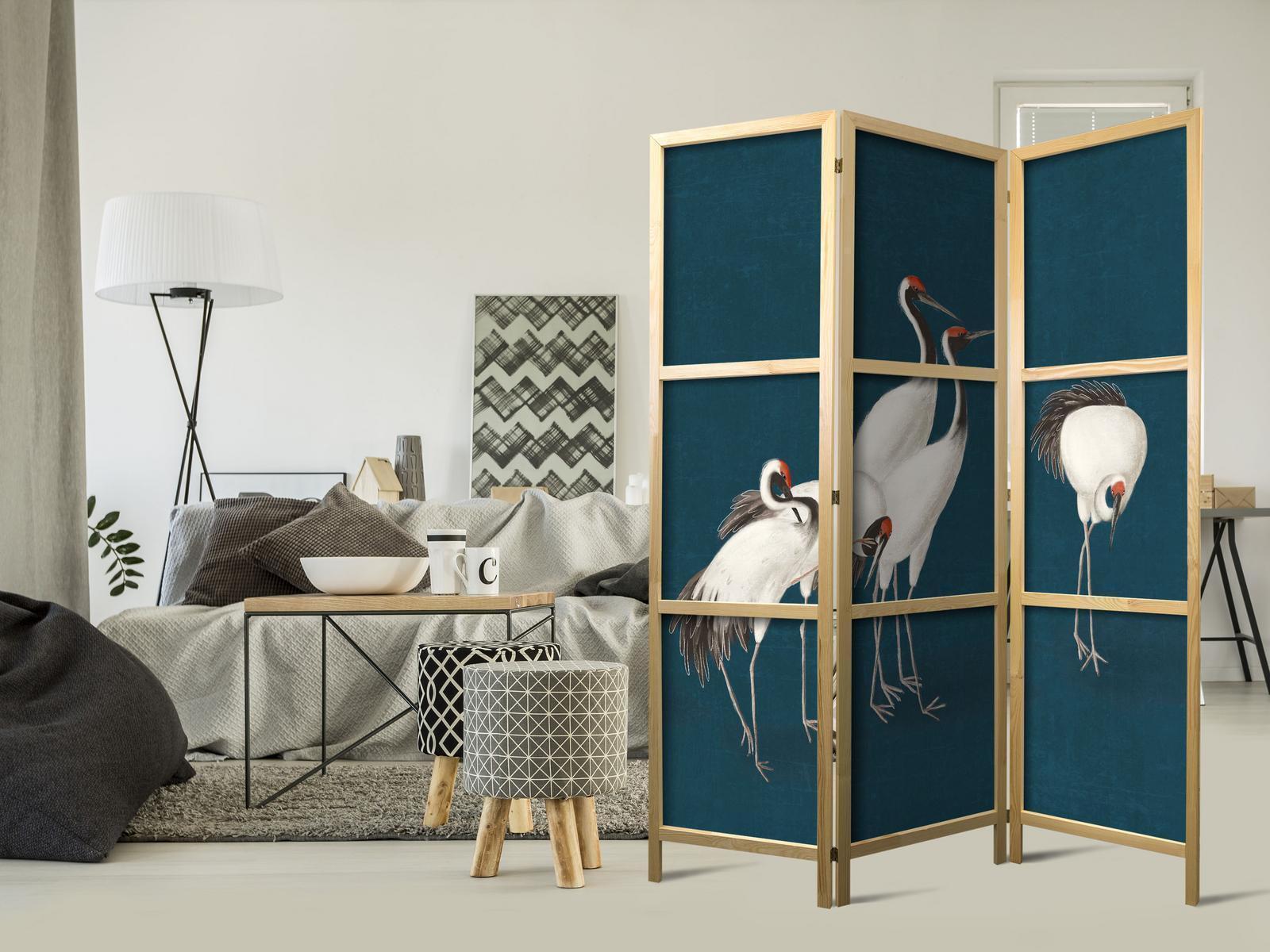 Liegen Ihnen der japanische Stil und die japanische Kultur am Herzen? Aber nicht nahe genug, um dort zu leben oder diesen Teil der Welt zu besuchen? Sind Sie auf der Suche nach einer modernen Dekoration für Ihr Zuhause? Sehen Sie sich die japanischen Paravents an. Dieses vergessene dekorative Element ist sowohl zu Hause als auch im Büro sehr nützlich. Für wenig Geld können Sie Ihre Wohnung fast wie neu einrichten. Japanische Paravents fügen sich perfekt in jeden Einrichtungsstil ein. Ein Paravent "Japanischer Paravent - Evening by the pond - a group of cranes drawn in dry pastel on a dark turquoise background" ist nicht nur eine tolle Dekorationsidee, sondern auch eine praktische Möglichkeit, für Privatsphäre zu sorgen. Müssen Sie aus Ihrem Wohnzimmer zwei Räume machen? Ein japanischer Paravent ist in einem solchen Fall die ideale Lösung. Darüber hinaus unterstreicht das einseitig aufgedruckte Motiv mit Bezug zu Japan Ihr Interesse an der orientalischen Kultur. Wenn Sie in einer Einzimmerwohnung leben, ist japanischer Paravent eine gute Lösung, um die verschiedenen Bereiche voneinander zu trennen. Auf diese Weise schaffen Sie definierte Bereiche für das Esszimmer oder das Wohnzimmer oder sogar trennen Ihre Home-Office-Ecke ab und nutzen ein schönes Objekt, das viel Charme in Ihr Interieur bringt.