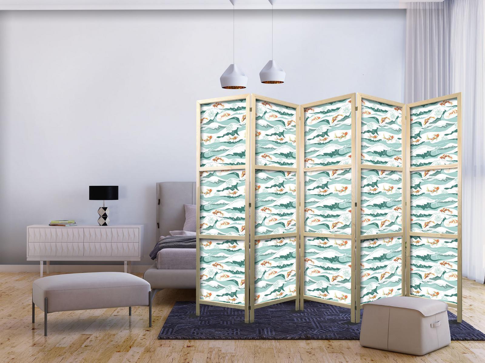Japanischer Paravent - Fish Jumping Over Waves - Oriental Fish and Water Lilies Among High Waves in Shades of Sea Green