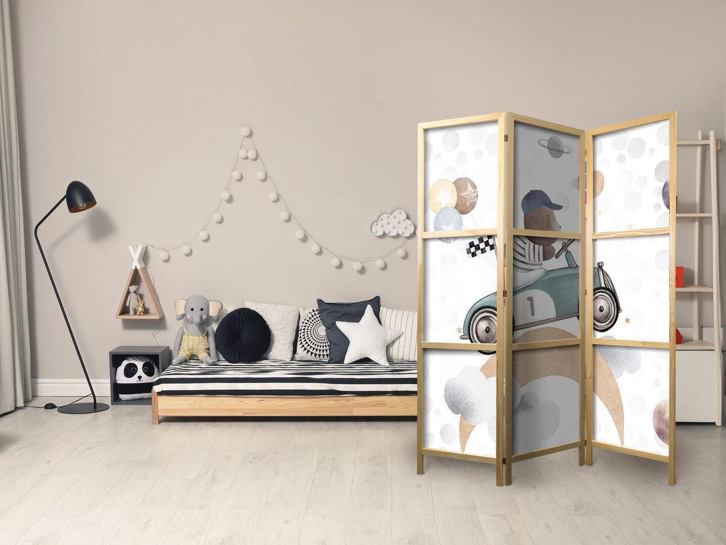 Die asiatischen Paravents aus unserer Kollektion werden auf hochwertiges Vlies gedruckt. Dank des Materials hat sich der sichere Paravent auch im Zimmer eines jungen Orient-Liebhaber bewährt. Asiatische Paravents sind perfekt für ein Restaurant in diesem Stil. Sie können die Bereiche zwischen den Tischen abgrenzen, so dass sich die Gäste wohlfühlen. Japanisches Paravent "Japanischer Paravent - Galactic Races - Bear Participating in Car Races Among Planets - Clouds - and Stars in Pastel Colors." ist auch eine gute Option für Schönheitssalons. Wenn Sie keine Wände bauen wollen, deren Layout Sie nach einer gewissen Zeit langweilen könnte, ist ein japanischer Paravent ideal für Sie! Es trennt die Kundenbereiche und verleiht ihnen Intimität.Details zur Produktsicherheit
