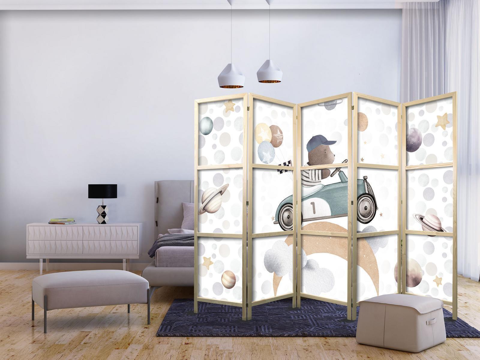 Japanischer Paravent "Japanischer Paravent - Galactic Races - Bear participating in car races among planets - clouds - and stars in pastel colors."