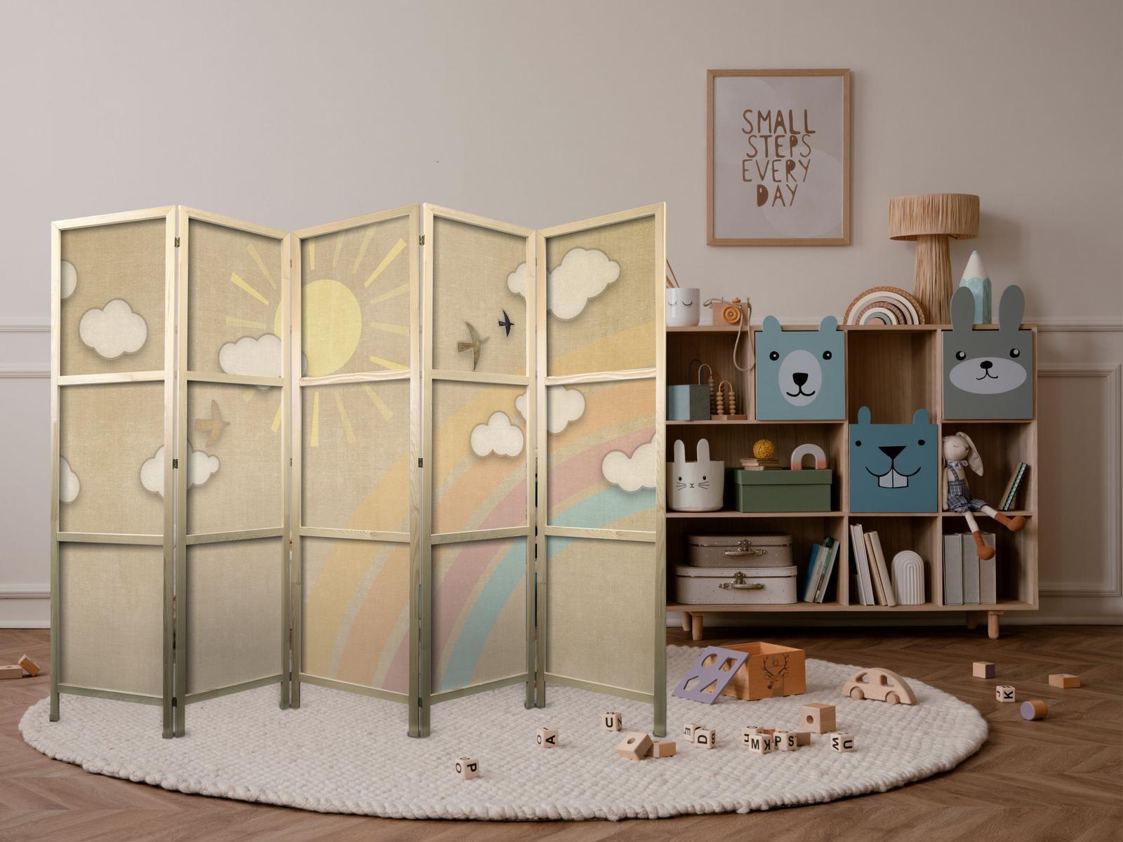 Liegen Ihnen der japanische Stil und die japanische Kultur am Herzen? Aber nicht nahe genug, um dort zu leben oder diesen Teil der Welt zu besuchen? Sind Sie auf der Suche nach einer modernen Dekoration für Ihr Zuhause? Sehen Sie sich die japanischen Paravents an. Dieses vergessene dekorative Element ist sowohl zu Hause als auch im Büro sehr nützlich. Für wenig Geld können Sie Ihre Wohnung fast wie neu einrichten. Japanische Paravents fügen sich perfekt in jeden Einrichtungsstil ein. Ein Paravent "Japanischer Paravent - Holiday Sky - A rainbow on a sunny day and flying birds." ist nicht nur eine tolle Dekorationsidee, sondern auch eine praktische Möglichkeit, für Privatsphäre zu sorgen. Müssen Sie aus Ihrem Wohnzimmer zwei Räume machen? Ein japanischer Paravent ist in einem solchen Fall die ideale Lösung. Darüber hinaus unterstreicht das einseitig aufgedruckte Motiv mit Bezug zu Japan Ihr Interesse an der orientalischen Kultur. Wenn Sie in einer Einzimmerwohnung leben, ist japanischer Paravent eine gute Lösung, um die verschiedenen Bereiche voneinander zu trennen. Auf diese Weise schaffen Sie definierte Bereiche für das Esszimmer oder das Wohnzimmer oder sogar trennen Ihre Home-Office-Ecke ab und nutzen ein schönes Objekt, das viel Charme in Ihr Interieur bringt.