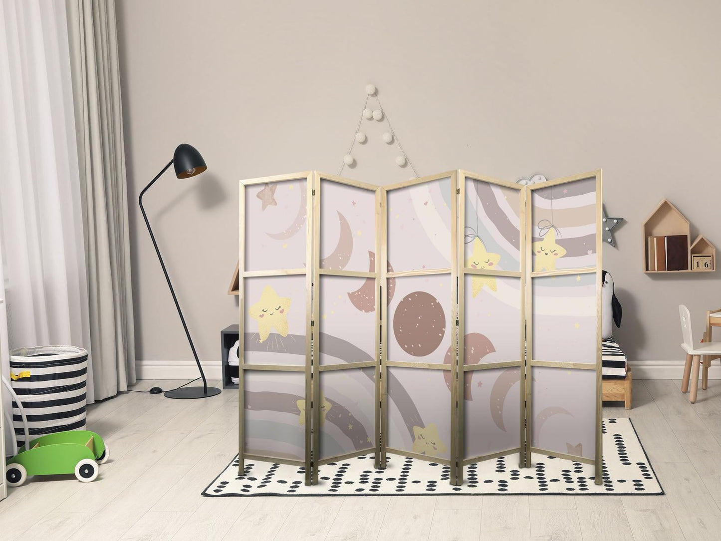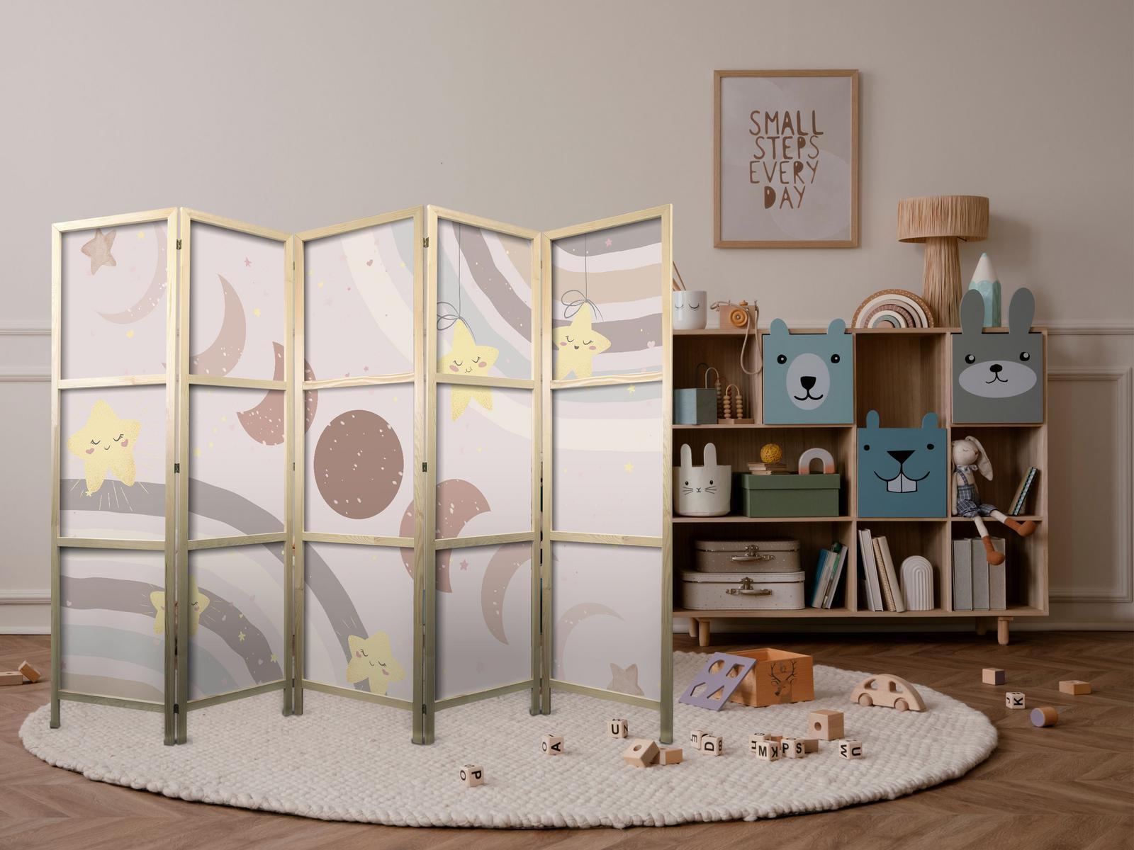 Japanischer Paravent "Japanischer Paravent - Joyful Sky - Yellow cheerful stars with a rainbow against the moon phases - in the sky colored light beige."