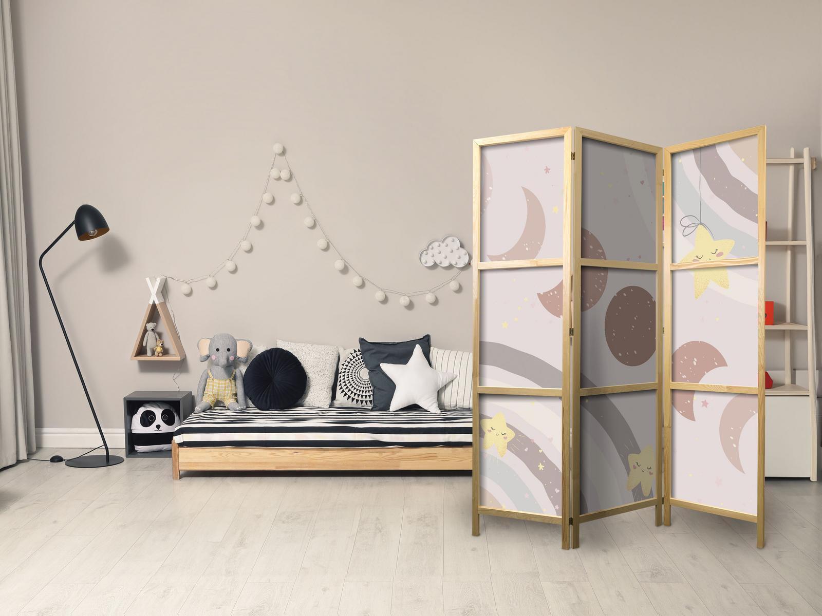 Liegen Ihnen der japanische Stil und die japanische Kultur am Herzen? Aber nicht nahe genug, um dort zu leben oder diesen Teil der Welt zu besuchen? Sind Sie auf der Suche nach einer modernen Dekoration für Ihr Zuhause? Sehen Sie sich die japanischen Paravents an. Dieses vergessene dekorative Element ist sowohl zu Hause als auch im Büro sehr nützlich. Für wenig Geld können Sie Ihre Wohnung fast wie neu einrichten. Japanische Paravents fügen sich perfekt in jeden Einrichtungsstil ein. Ein Paravent "Japanischer Paravent - Joyful Sky - Yellow cheerful stars with a rainbow against the moon phases - in the sky colored light beige." ist nicht nur eine tolle Dekorationsidee, sondern auch eine praktische Möglichkeit, für Privatsphäre zu sorgen. Müssen Sie aus Ihrem Wohnzimmer zwei Räume machen? Ein japanischer Paravent ist in einem solchen Fall die ideale Lösung. Darüber hinaus unterstreicht das einseitig aufgedruckte Motiv mit Bezug zu Japan Ihr Interesse an der orientalischen Kultur. Wenn Sie in einer Einzimmerwohnung leben, ist japanischer Paravent eine gute Lösung, um die verschiedenen Bereiche voneinander zu trennen. Auf diese Weise schaffen Sie definierte Bereiche für das Esszimmer oder das Wohnzimmer oder sogar trennen Ihre Home-Office-Ecke ab und nutzen ein schönes Objekt, das viel Charme in Ihr Interieur bringt.