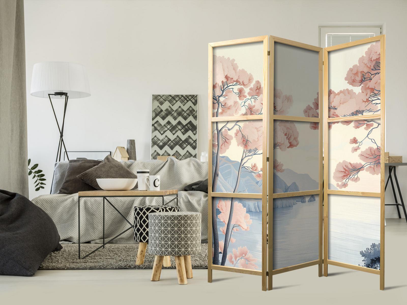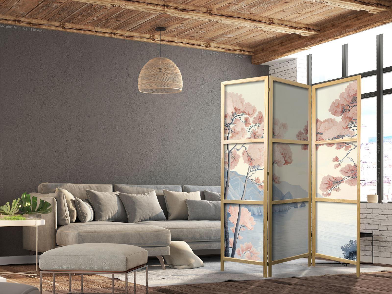 Liegen Ihnen der japanische Stil und die japanische Kultur am Herzen? Aber nicht nahe genug, um dort zu leben oder diesen Teil der Welt zu besuchen? Sind Sie auf der Suche nach einer modernen Dekoration für Ihr Zuhause? Sehen Sie sich die japanischen Paravents an. Dieses vergessene dekorative Element ist sowohl zu Hause als auch im Büro sehr nützlich. Für wenig Geld können Sie Ihre Wohnung fast wie neu einrichten. Japanische Paravents fügen sich perfekt in jeden Einrichtungsstil ein. Ein Paravent "Japanischer Paravent - Landscape with the Ocean - Cliffs - and Trees in Delicate Pink Shades." ist nicht nur eine tolle Dekorationsidee, sondern auch eine praktische Möglichkeit, für Privatsphäre zu sorgen. Müssen Sie aus Ihrem Wohnzimmer zwei Räume machen? Ein japanischer Paravent ist in einem solchen Fall die ideale Lösung. Darüber hinaus unterstreicht das einseitig aufgedruckte Motiv mit Bezug zu Japan Ihr Interesse an der orientalischen Kultur. Wenn Sie in einer Einzimmerwohnung leben, ist japanischer Paravent eine gute Lösung, um die verschiedenen Bereiche voneinander zu trennen. Auf diese Weise schaffen Sie definierte Bereiche für das Esszimmer oder das Wohnzimmer oder sogar trennen Ihre Home-Office-Ecke ab und nutzen ein schönes Objekt, das viel Charme in Ihr Interieur bringt.