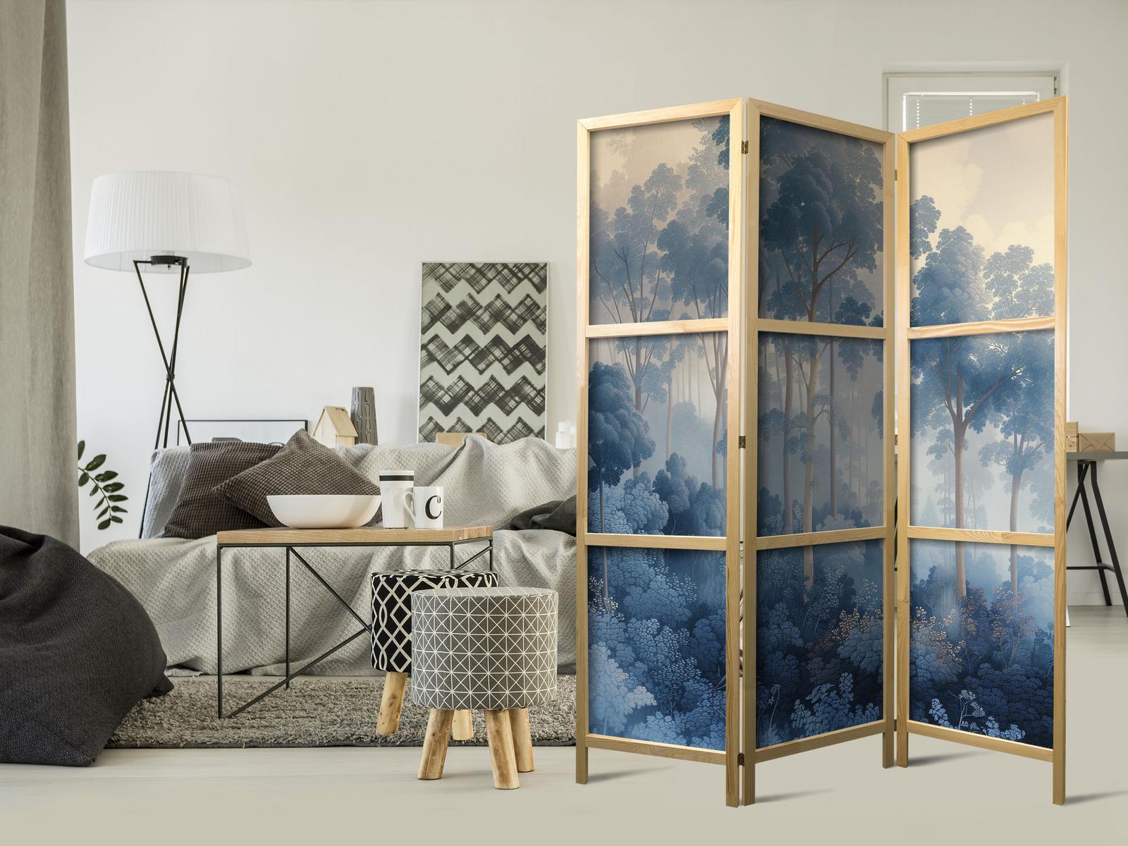 Japanischer Paravent - Landscape with Trees in Illustrative Style - Fairy-Tale Blue Forest