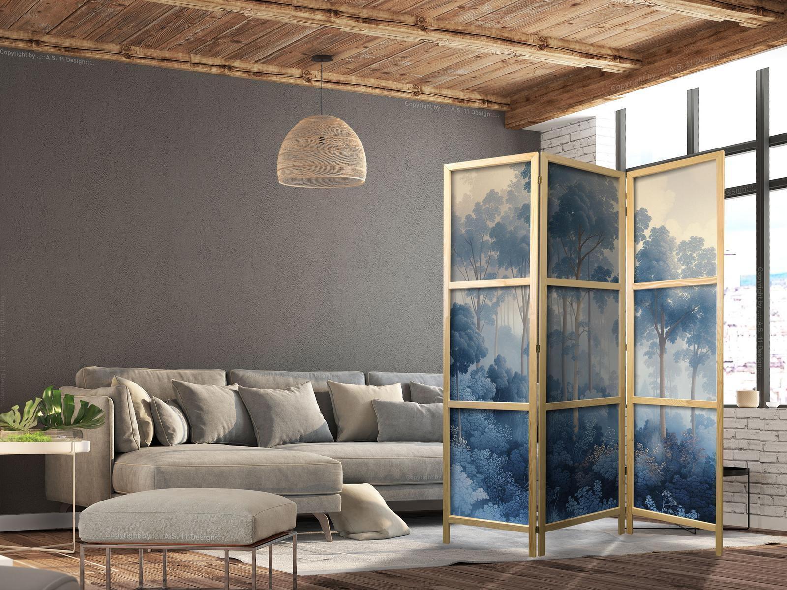 Japanischer Paravent "Japanischer Paravent - Landscape with Trees in Illustrative Style - Fairy-Tale Blue Forest"