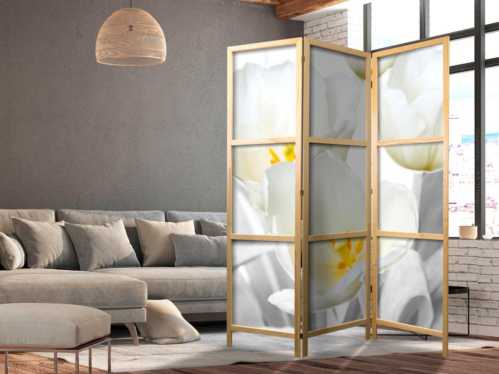 Liegen Ihnen der japanische Stil und die japanische Kultur am Herzen? Aber nicht nahe genug, um dort zu leben oder diesen Teil der Welt zu besuchen? Sind Sie auf der Suche nach einer modernen Dekoration für Ihr Zuhause? Sehen Sie sich die japanischen Paravents an. Dieses vergessene dekorative Element ist sowohl zu Hause als auch im Büro sehr nützlich. Für wenig Geld können Sie Ihre Wohnung fast wie neu einrichten. Japanische Paravents fügen sich perfekt in jeden Einrichtungsstil ein. Ein Paravent "Japanischer Paravent - Luminous Tulips I" ist nicht nur eine tolle Dekorationsidee, sondern auch eine praktische Möglichkeit, für Privatsphäre zu sorgen. Müssen Sie aus Ihrem Wohnzimmer zwei Räume machen? Ein japanischer Paravent ist in einem solchen Fall die ideale Lösung. Darüber hinaus unterstreicht das einseitig aufgedruckte Motiv mit Bezug zu Japan Ihr Interesse an der orientalischen Kultur. Wenn Sie in einer Einzimmerwohnung leben, ist japanischer Paravent eine gute Lösung, um die verschiedenen Bereiche voneinander zu trennen. Auf diese Weise schaffen Sie definierte Bereiche für das Esszimmer oder das Wohnzimmer oder sogar trennen Ihre Home-Office-Ecke ab und nutzen ein schönes Objekt, das viel Charme in Ihr Interieur bringt.