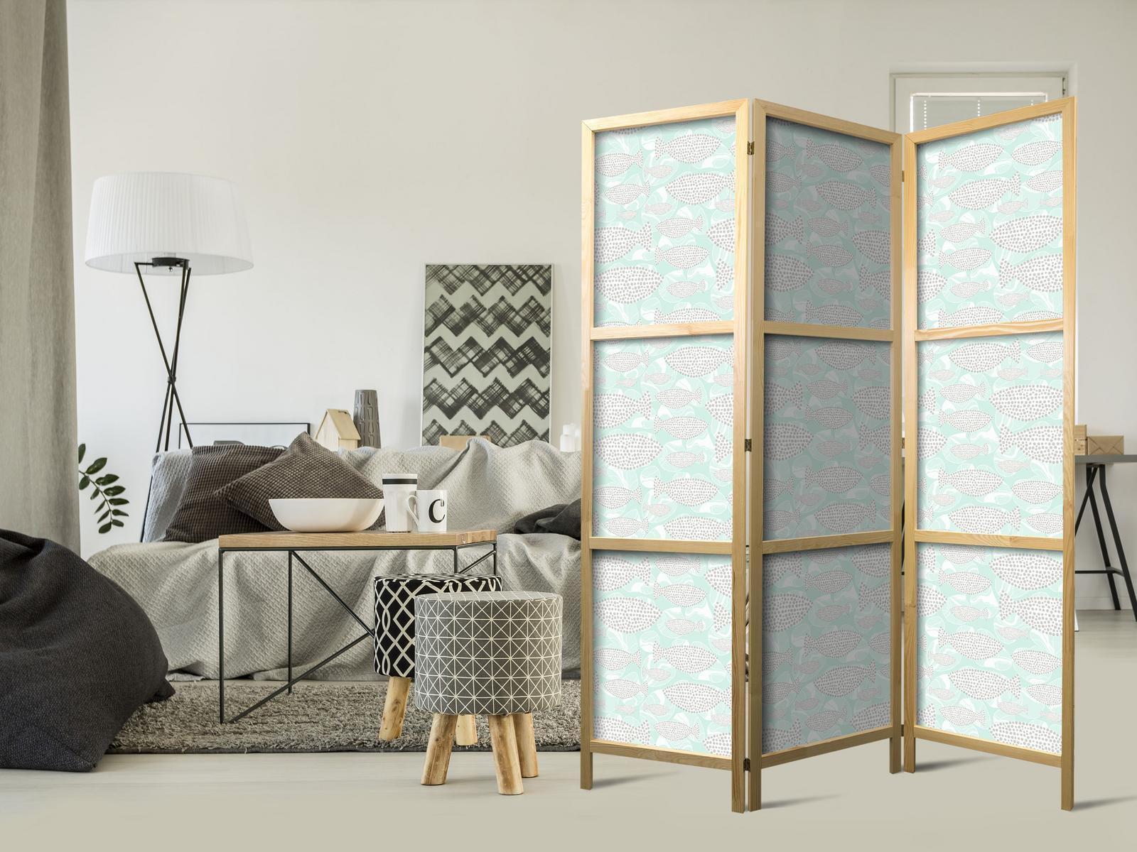 Liegen Ihnen der japanische Stil und die japanische Kultur am Herzen? Aber nicht nahe genug, um dort zu leben oder diesen Teil der Welt zu besuchen? Sind Sie auf der Suche nach einer modernen Dekoration für Ihr Zuhause? Sehen Sie sich die japanischen Paravents an. Dieses vergessene dekorative Element ist sowohl zu Hause als auch im Büro sehr nützlich. Für wenig Geld können Sie Ihre Wohnung fast wie neu einrichten. Japanische Paravents fügen sich perfekt in jeden Einrichtungsstil ein. Ein Paravent "Japanischer Paravent - Minimalist Fish - Fish from Gray Dots on the Crystal Clear Water Surface in Mint Green" ist nicht nur eine tolle Dekorationsidee, sondern auch eine praktische Möglichkeit, für Privatsphäre zu sorgen. Müssen Sie aus Ihrem Wohnzimmer zwei Räume machen? Ein japanischer Paravent ist in einem solchen Fall die ideale Lösung. Darüber hinaus unterstreicht das einseitig aufgedruckte Motiv mit Bezug zu Japan Ihr Interesse an der orientalischen Kultur. Wenn Sie in einer Einzimmerwohnung leben, ist japanischer Paravent eine gute Lösung, um die verschiedenen Bereiche voneinander zu trennen. Auf diese Weise schaffen Sie definierte Bereiche für das Esszimmer oder das Wohnzimmer oder sogar trennen Ihre Home-Office-Ecke ab und nutzen ein schönes Objekt, das viel Charme in Ihr Interieur bringt.