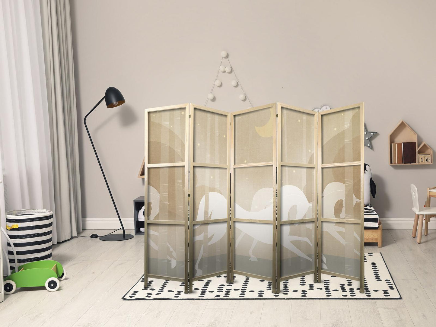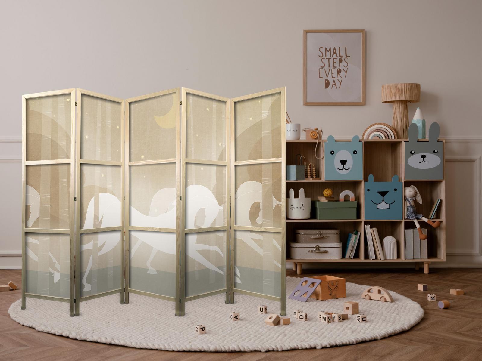 Liegen Ihnen der japanische Stil und die japanische Kultur am Herzen? Aber nicht nahe genug, um dort zu leben oder diesen Teil der Welt zu besuchen? Sind Sie auf der Suche nach einer modernen Dekoration für Ihr Zuhause? Sehen Sie sich die japanischen Paravents an. Dieses vergessene dekorative Element ist sowohl zu Hause als auch im Büro sehr nützlich. Für wenig Geld können Sie Ihre Wohnung fast wie neu einrichten. Japanische Paravents fügen sich perfekt in jeden Einrichtungsstil ein. Ein Paravent "Japanischer Paravent - Moonlit Steeds - Horses galloping among trees on a starry night." ist nicht nur eine tolle Dekorationsidee, sondern auch eine praktische Möglichkeit, für Privatsphäre zu sorgen. Müssen Sie aus Ihrem Wohnzimmer zwei Räume machen? Ein japanischer Paravent ist in einem solchen Fall die ideale Lösung. Darüber hinaus unterstreicht das einseitig aufgedruckte Motiv mit Bezug zu Japan Ihr Interesse an der orientalischen Kultur. Wenn Sie in einer Einzimmerwohnung leben, ist japanischer Paravent eine gute Lösung, um die verschiedenen Bereiche voneinander zu trennen. Auf diese Weise schaffen Sie definierte Bereiche für das Esszimmer oder das Wohnzimmer oder sogar trennen Ihre Home-Office-Ecke ab und nutzen ein schönes Objekt, das viel Charme in Ihr Interieur bringt.