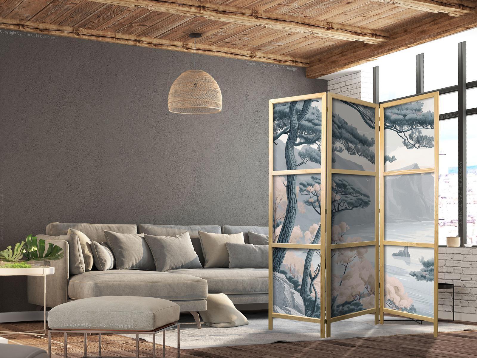 Japanischer Paravent "Japanischer Paravent - Mountainous Coastline with Trees and Rocks in Light Pastel Blues."